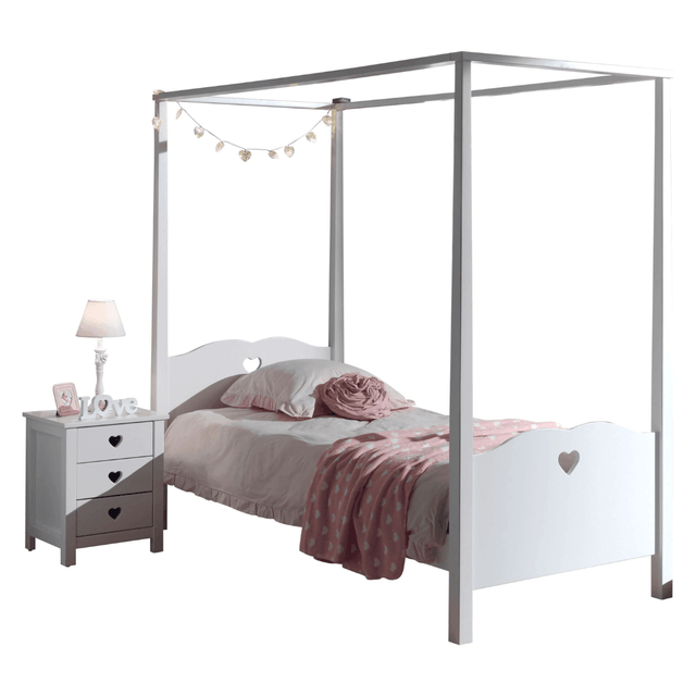 Az Amori35 gyerek bútor szett egy letisztult, és elegáns termék, amely mesebeli dizájnnal rendelkezik. Fehér színe, és a szív alakú faragások igazán vidám hangulatot teremtenek. A szett tartalmaz egy baldachinos ágyat -ágyrács nélkül- (211x96x187cm), és egy három fiókos éjjeliszekrényt (45x40x55cm).
