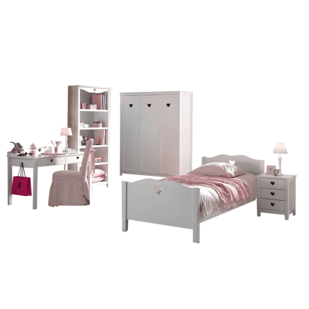 Rendezd be egyszerűen a gyermeked szobáját az Amori55 gyerek bútor szettel. Minden a készlet része, amire csak szükségetek lehet. A fehérre lakkozott fenyőből készült bútorok nem csak szépek, és elegánsak, hanem tartósak és funkcionálisak is. Az összes bútoron szerepel az Amori jellegzetes szív formájú faragása, mely tökéletes összhangot teremt a termékek között. A szett tartalma, és méretei: ágykeret ágyráccsal 211x96x80cm, éjjeliszekrény 45x40x55cm, íróasztal 130x60x84.5cm, polc 90x190x40cm, szekrény 159x57x190.5cm.