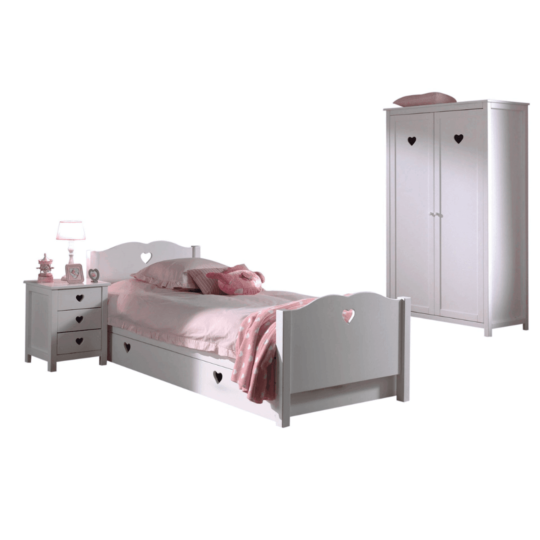 Az Amori56 gyerek bútor szett egy letisztult, és elegáns kombináció, amely mesebeli dizájnnal rendelkezik. Fehér színe, és a szív alakú faragások igazán vidám hangulatot teremtenek. A szett tartalmaz egy ágyat ágyráccsal (211x96x80cm), egy kihúzható ágyneműtartót, egy három fiókos éjjeliszekrényt (45x40x55cm), és egy kétajtós szekrényt (110x57x190.5cm).
