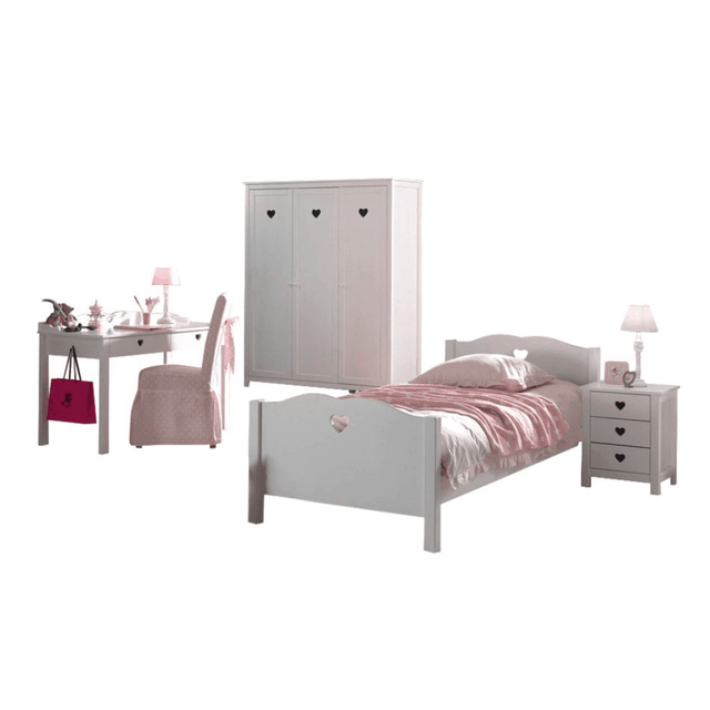 Az Amori58 gyerek bútor szett egy letisztult, és elegáns termék, amely mesebeli dizájnnal rendelkezik. Fehér színe, és a szív alakú faragások igazán vidám hangulatot teremtenek. A szett tartalmaz egy ágyat ágyráccsal (211x96x80cm), egy íróasztalt (130x60x84.5cm), egy három fiókos éjjeliszekrényt (45x40x55cm), és egy három ajtós szekrényt (159x57x190.5cm).