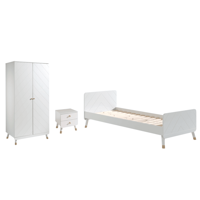 A Billy314 gyerek bútor szett kiváló választás minden olyan gyerekszobába, ahol az elegancia, és a minimalizmus a lényeg. A fehérre lakozott bútorok letisztult, mégis modern hangulatot kölcsönöznek a térnek, az arany láb végek és fogantyúk pedig még tovább emelik a trendi megjelenést. A szett tartalmaz egy ágyat, ágyráccsal, melynek mérete 90x200cm, egy éjjeliszekrényt (43x40x45cm), és egy két ajtós szekrényt (100x59x200cm).