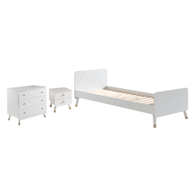 A Billy814 gyerek bútor szett, egy letisztult, skandináv dizájn ihlette készlet, amely tökéletes választás iskolás gyermekek számára. Vintage kialakítása kiváló összhangban van a modern arany részletekkel, mintázattal és a fehér színnel, így könnyedén illeszthető bármilyen enteriőrbe. A szett tartalmaz egy ágyat (ágyráccsal), amihez 90x200cm-es matrac használható, egy 43x40x45cm-es éjjeliszekrényt, és egy 100x57x88cm-es három fiókos komódot. A matrac nem tartozék.