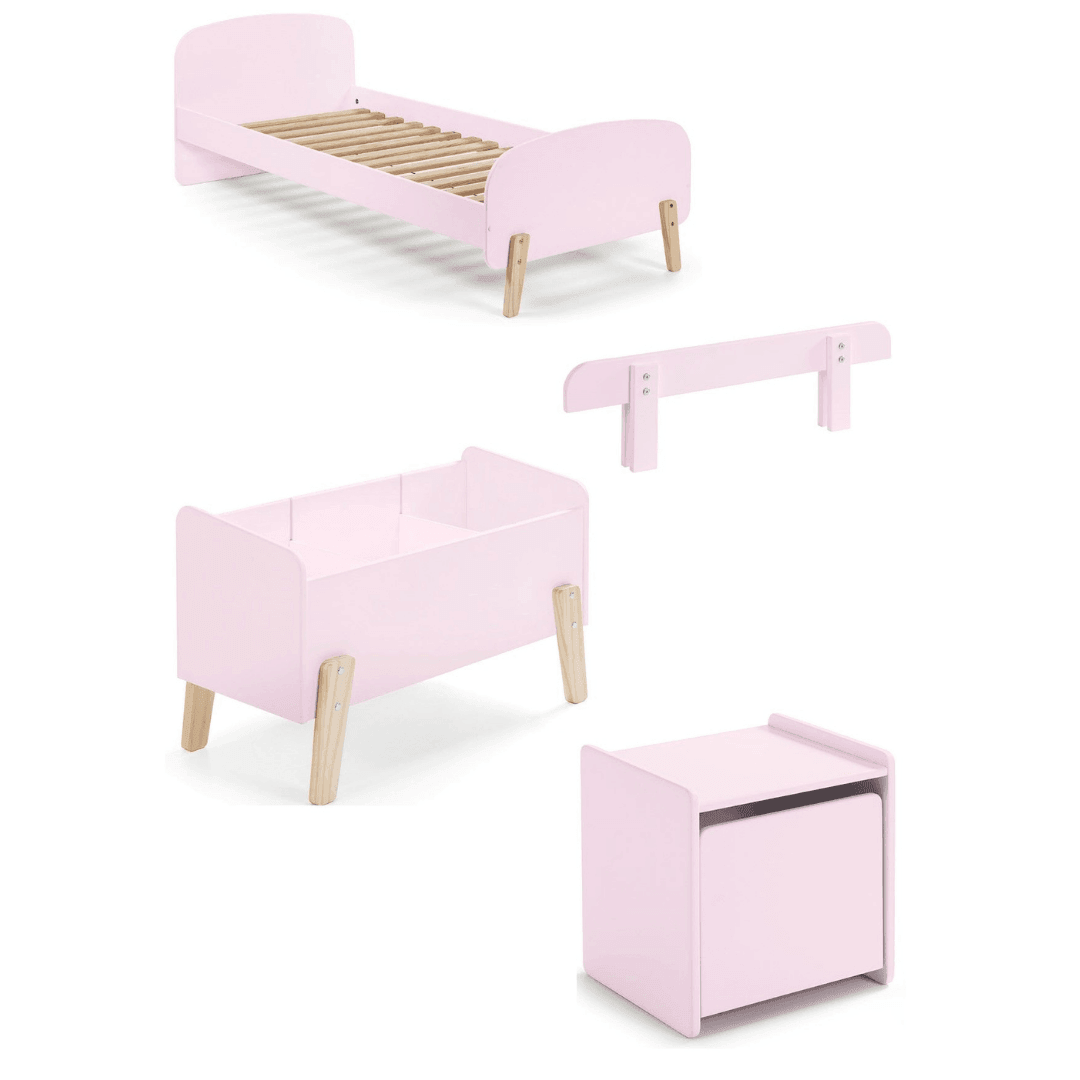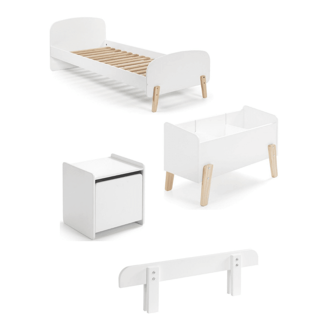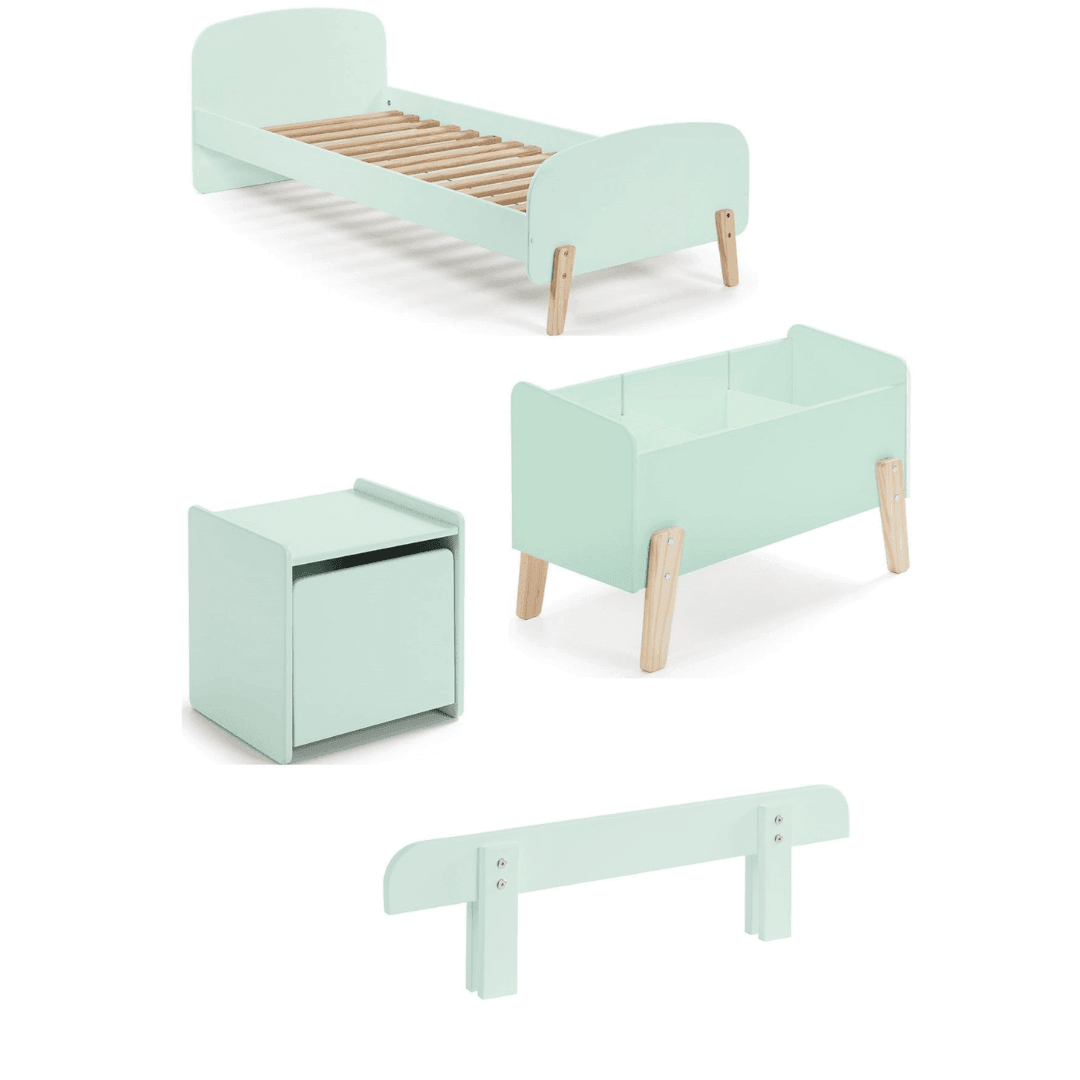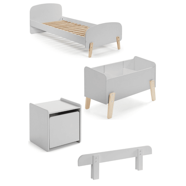 A Kiddy CO05, egy minimalista, és modern megjelenésű gyerek bútor szett, mely a skandináv dizájn elemeket hordozza magán. A színesre festett fa anyagok tömör fenyővel egészülnek ki, ezáltal tartós és stabil bútorokat hozva létre. A szett tartalmaz egy ágyat biztonsági sínnel és ágyráccsal, melyhez 90x200cm-es matrac használható, egy éjjeliszekrényt (40x36x41cm), és egy játék tárolót (80x39x47cm) is. A készlet világosszürke, világoszöld, rózsaszín, és fehér színekben kapható.