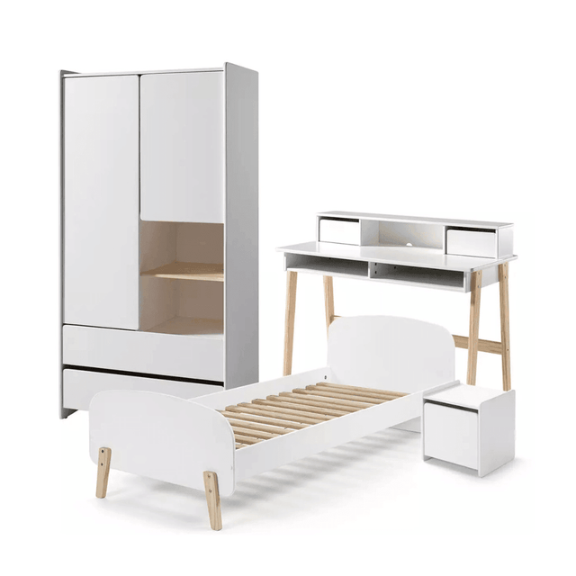 A Kiddy CO13 bútor szett egyszerre felel meg gyerek és ifjúsági készletnek is, hiszen letisztult, minimalista dizájnnal rendelkezik. Fehérre lakkozott elemeit, natúr színű, tömör fenyő részletek egészítik ki, így tökéletes összhangot alkotnak. A készlet része egy ágy ágyráccsal (90x200cm), egy éjjeliszekrény (40x36x41cm), egy 2 ajtós, polcos, akasztós, fiókos szekrény (90x55x180cm), és egy íróasztal (120x55x90cm).