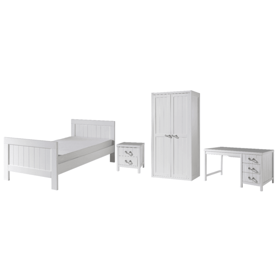 Rendezd be gyermeked szobáját a Lewis CO04 ifjúsági és gyermek bútor szettel, amely modern és praktikus darabokból áll. Letisztult mintázata, és fehér színe miatt minden belső térben jól mutat. A készlet tartalma egy ágy, melyhez 90x200cm-es matrac használható, egy 50x46x55.5cm-es éjjeliszekrény, egy 150x70x76cm-es íróasztal, és egy 100x59x200cm-es akasztós, és polcos szekrény. Az ágyhoz az ágyrács és a matrac nem tartozék.