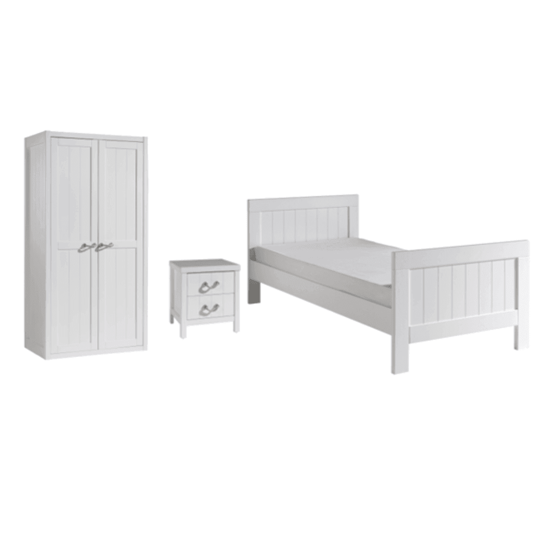 A Lewis CO52 gyerek bútor szett egy igényes, elegáns megjelenésű, praktikus készlet, amelyben minden darab fehérre lakkozott anyaggal, és függőleges csikozású mintával van ellátva. Bármilyen stílusú belső térbe könnyen beleillik, és tartós anyagainak köszönhetően időtálló marad. A szett tartalmaz egy ágyat, ágyráccsal melyhez 90x200cm-es matrac használható, egy 50x46x55.5cm-es két fiókos éjjeliszekrényt, és egy 100x59x200cm-es két ajtós szekrényt, amelyben polcok, és akasztós rész egyaránt megtalálható. Az ágyhoz a matrac nem tartozék.