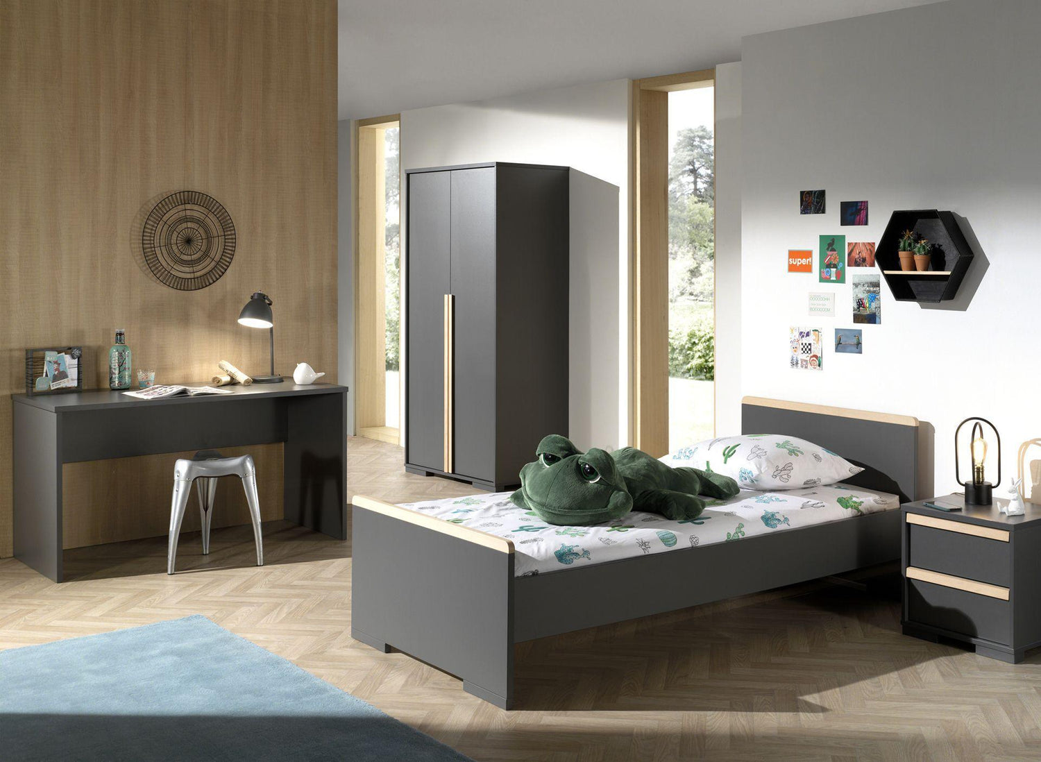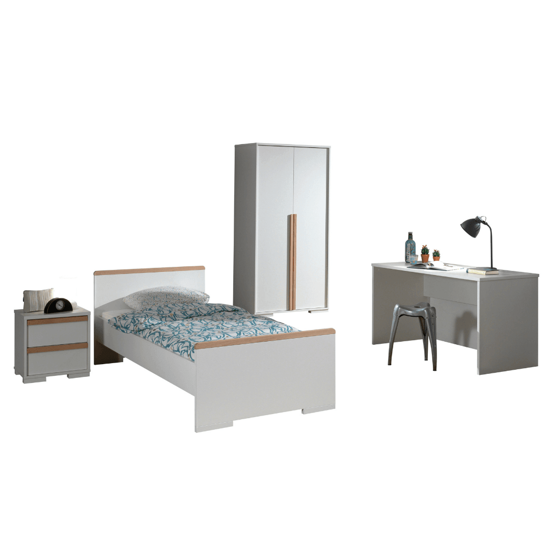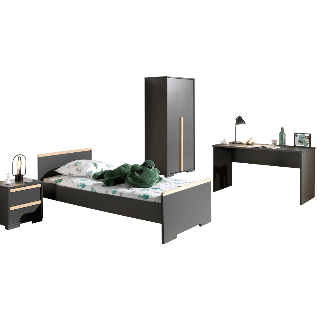 Rendezd be gyermeked szobáját a London CO04 gyerek és ifjúsági szettel. Két színben érhető el a készlet, sötétszürke, és fehér festéssel, melyekhez natúr színű fenyő részletek párosulnak, így könnyedén illszkednek bármilyen enteriőrbe. A szett tartalmaz egy ágyat, melyhez 90x200cm-es matrac használható, egy 48x40x48.8cm-es éjjeliszekrényt, egy 140x65x75cm-es íróasztalt, és egy 98.4x56x195.2cm-es 2 ajtós szekrényt. Az ágyhoz az ágyrács és a matrac, illetve a további dekoráció nem tartozék.