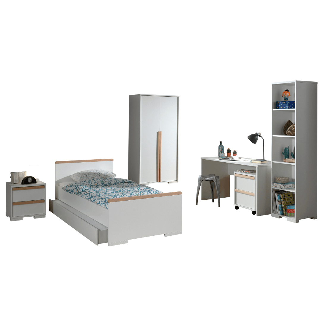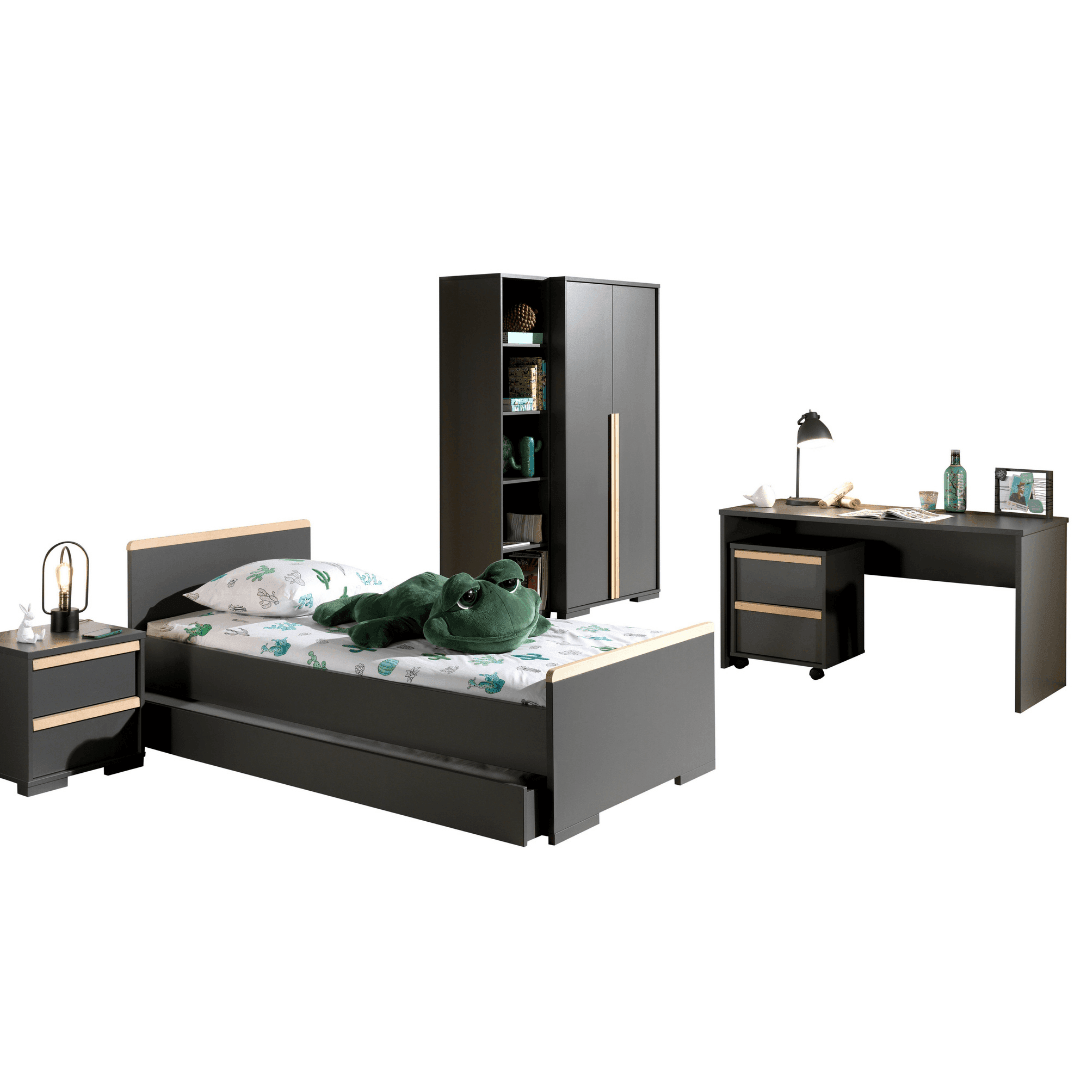 Rendezd be teljesen gyermeked szobáját a London CO07 gyerek és ifjúsági szettel. Szinte a teljes kollekciót megveheted egybe, így nem kell külön külön keresgélni a bútorokat. Két színben érhető el a készlet, sötétszürke, és fehér festéssel, melyekhez natúr színű fenyő részletek párosulnak. A szett tartalmaz egy ágyat -ágyneműtartóval-, melyhez 90x200cm-es matrac használható, egy 48x40x48.8cm-es éjjeliszekrényt, egy 140x65x75cm-es íróasztalt, egy 48x40x59.7cm-es guruló komódot, egy 45.5x45x195.2cm-es polcrendszert, és egy 98.4x56x195.2cm-es 2 ajtós szekrényt. Az ágyhoz az ágyrács és a matrac, illetve a további dekoráció nem tartozék.