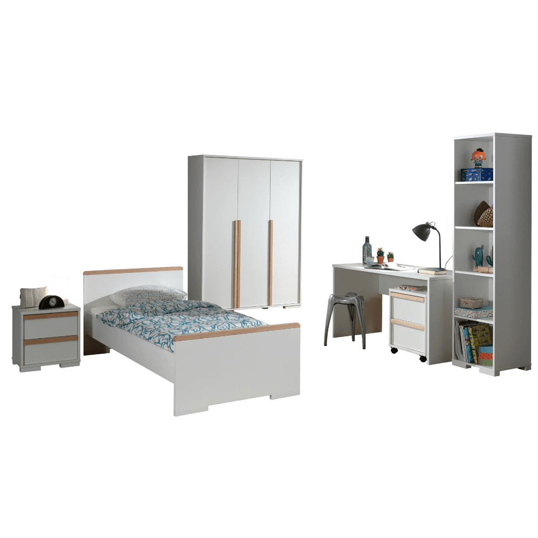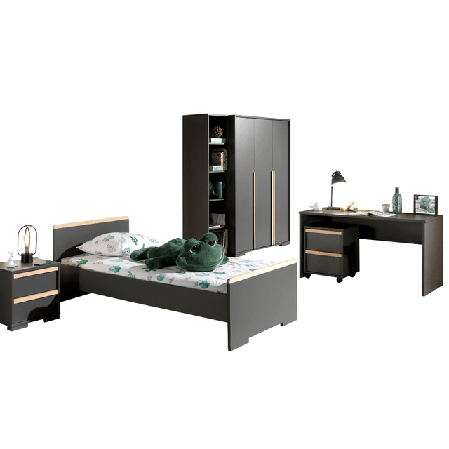 Rendezd be gyermeked szobáját a Vipack gyártó London CO11 gyerek és ifjúsági szettel. Szinte a teljes kollekciót megveheted egybe, így nem kell egyesével keresgélni a bútorokat. Két színben érhető el a készlet, sötétszürke, és fehér festéssel, melyekhez natúr színű fenyő részletek párosulnak. A szett tartalmaz egy ágyat, melyhez 90x200cm-es matrac használható, egy 48x40x48.8cm-es éjjeliszekrényt, egy 140x65x75cm-es íróasztalt, egy 48x40x59.7cm-es guruló komódot, egy 45.5x45x195.2cm-es polcrendszert, és egy 145.5x56x195.2cm-es 3 ajtós szekrényt. Az ágyhoz az ágyrács és a matrac, illetve a további dekoráció nem tartozék.