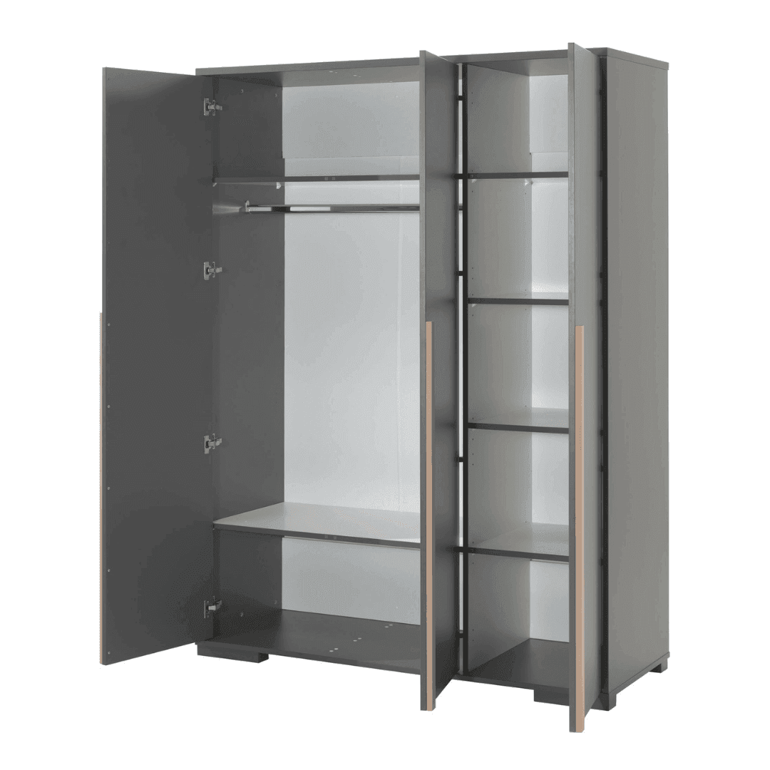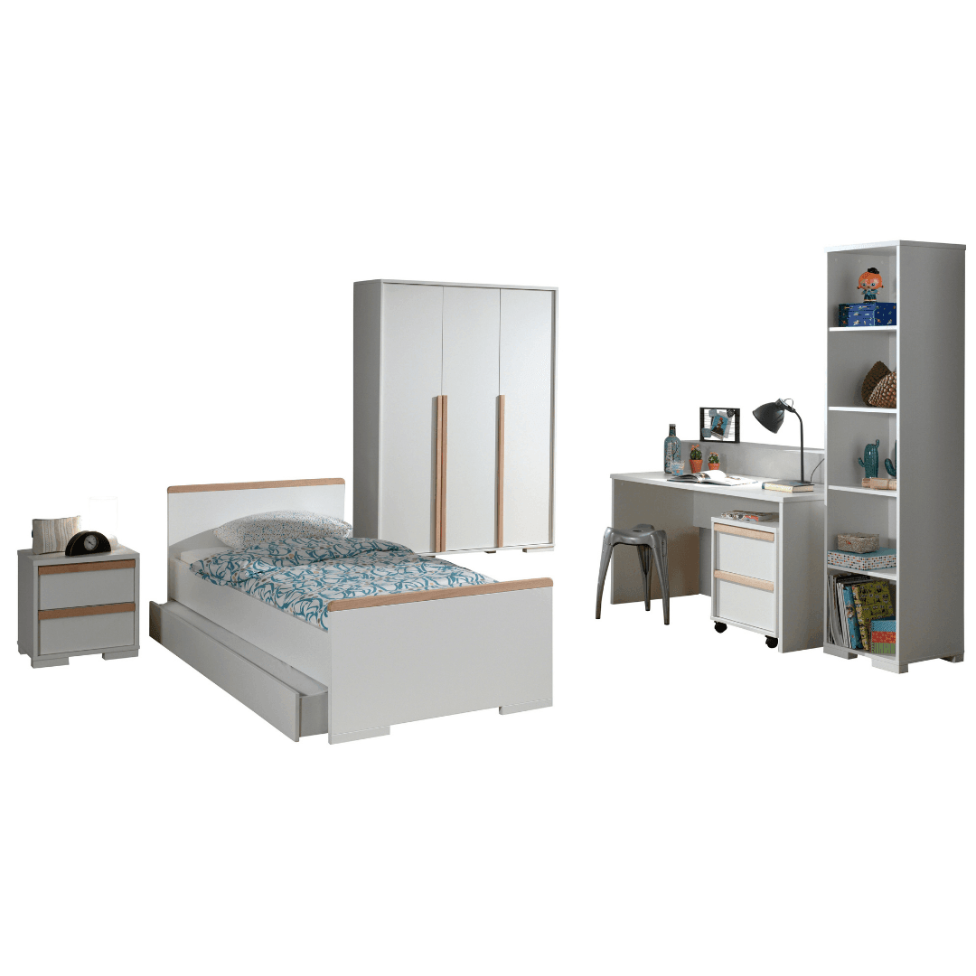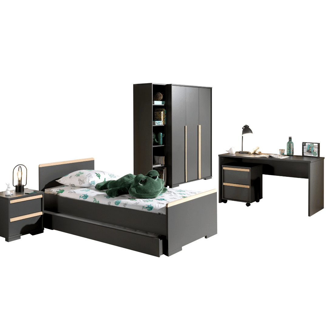 Rendezd be teljesen gyermeked szobáját a London CO12 gyerek és ifjúsági szettel. Szinte a teljes kollekciót megveheted egybe, így nem kell külön külön keresgélni a bútorokat. Két színben érhető el a készlet, sötétszürke, és fehér festéssel, melyekhez natúr színű fenyő részletek párosulnak. A szett tartalmaz egy ágyat -ágyneműtartóval-, melyhez 90x200cm-es matrac használható, egy 48x40x48.8cm-es éjjeliszekrényt, egy 140x65x75cm-es íróasztalt, egy 48x40x59.7cm-es guruló komódot, egy 45.5x45x195.2cm-es polcrendszert, és egy 145.5x56x195.2cm-es 3 ajtós szekrényt. Az ágyhoz az ágyrács és a matrac, illetve a további dekoráció nem tartozék.