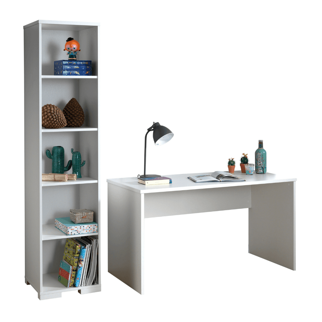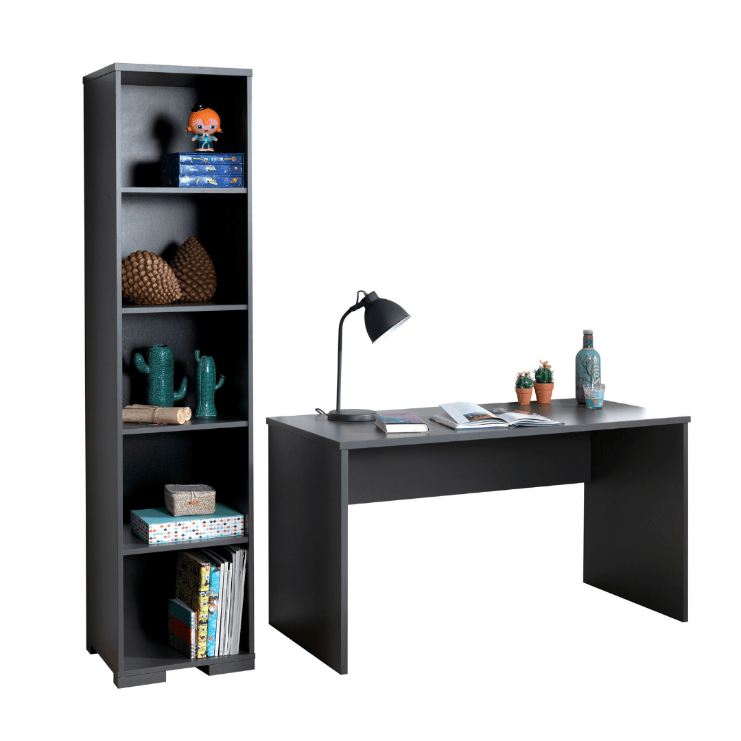 A London CO14 gyerek bútor szett egy igazán trendi, és minimalista stílusú készlet, mely sötétszürke és fehér színben érhető el. Anyagainak köszönhetően tartósak, és időtállóak maradnak. A készlet tartalmaz egy 140x65x75cm-es íróasztalt, mely elegendő helyet biztosit a tanuláshoz, és egy 45.5x45x195.2cm-es polcrendszert, ami segít átláthatóvá, és rendben tartani a tankönyveket. A dekoráció nem tartozék.