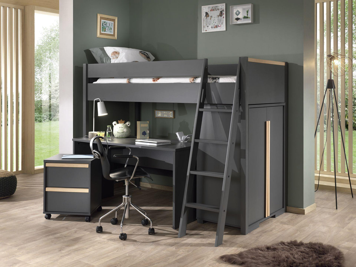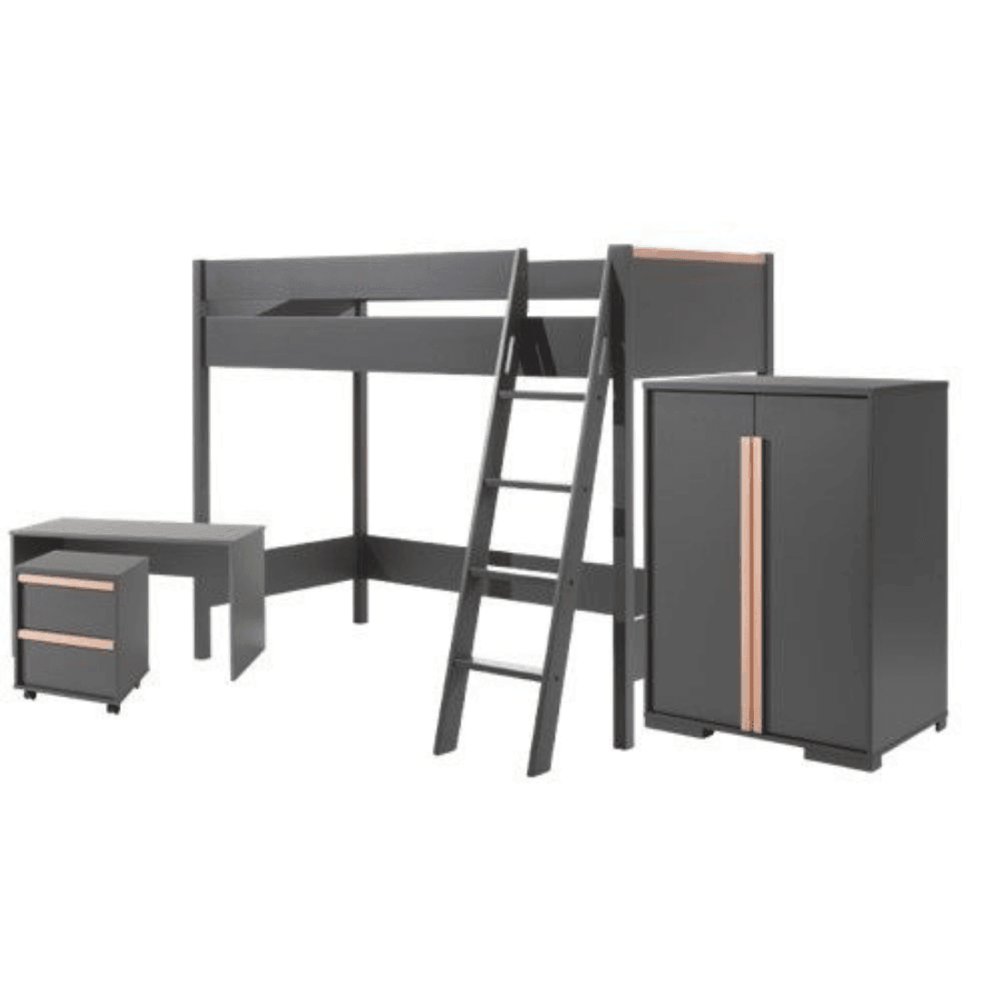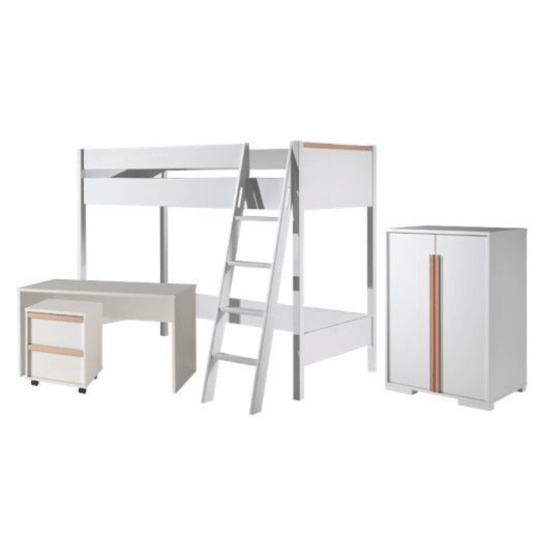 Ismerd meg a London CO19 gyerek és ifjúsági bútor szettet, mely helytakarékos megoldást nyújt a gyerekszobában. A magasított ágy -melyhez 90x200cm-es matrac használható- alatti hely tökéletesen alkalmas hogy a készlet többi része beférjen alá, így egy szinte teljesen berendezett szobát kapunk mindössze két négyzetméteren. A szett tartalmaz egy ágyat, melyhez a létrát igény szerint tehetjük a jobb és a bal oldalra is, egy 140x65x75cm-es íróasztalt, egy 48x40x59.7cm-es guruló komódot, és egy 86x56x116.2cm-es kabinetet.
