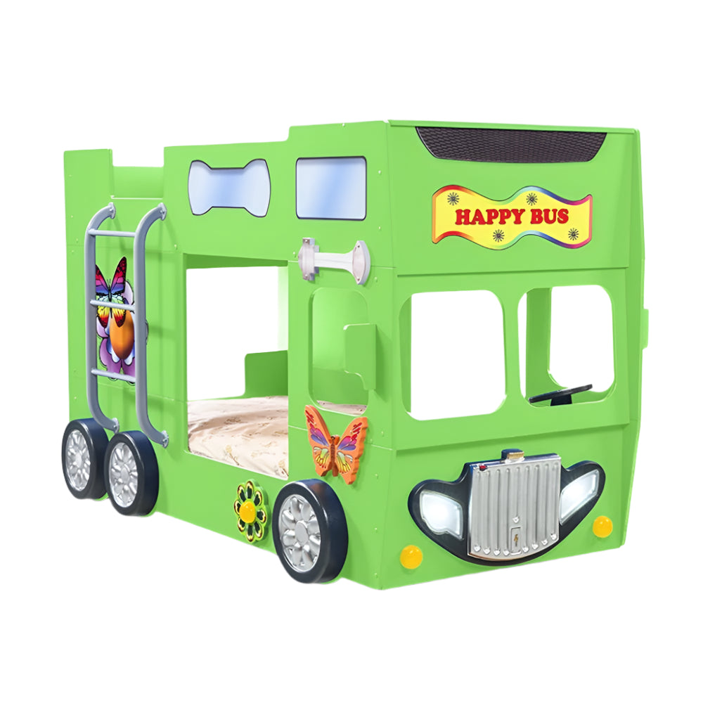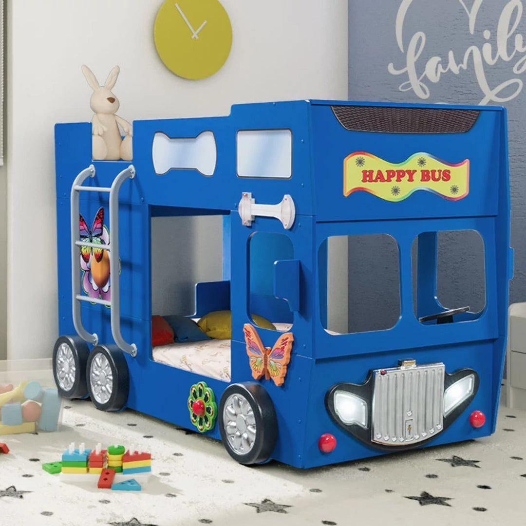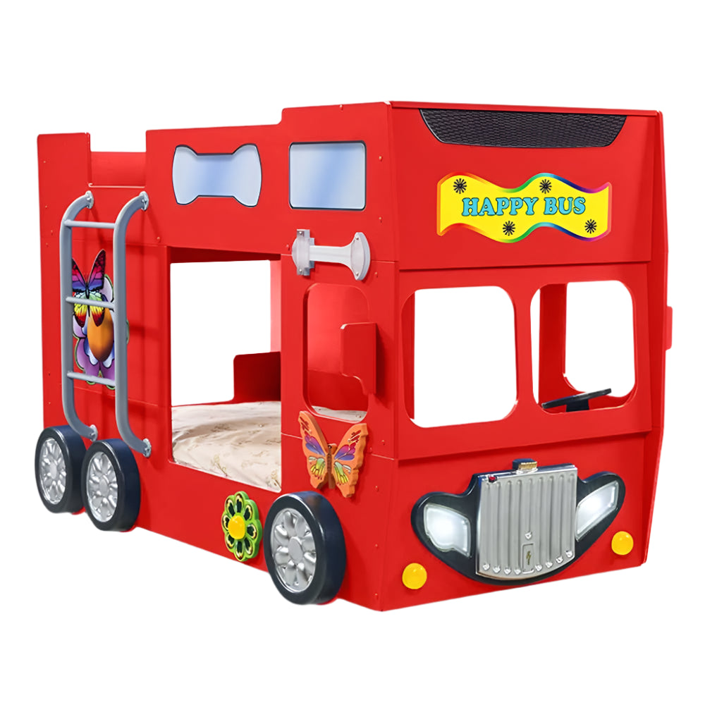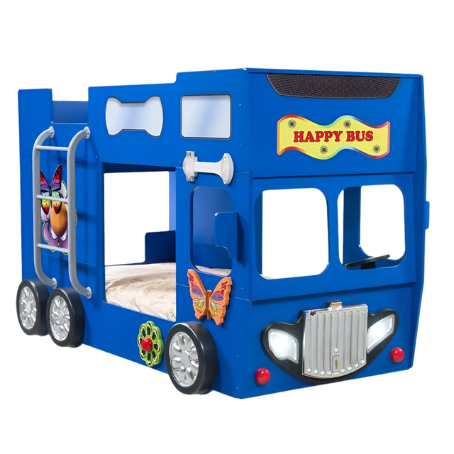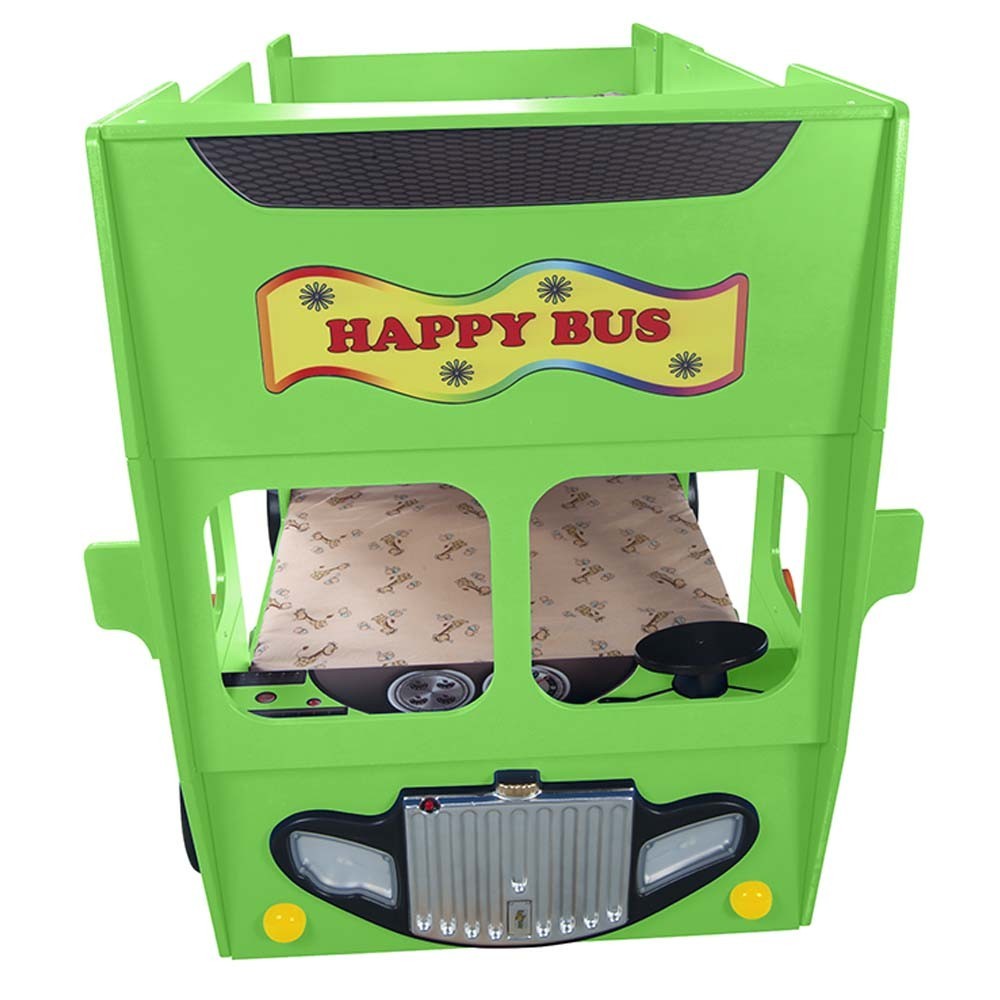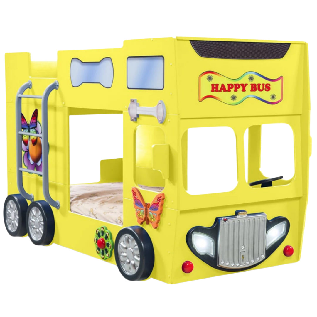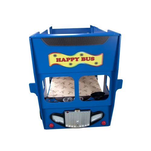 A Happy Bus egy egyedi emeletes ágy gyerekeknek, busz alakban vidám motívumokkal. Látványos LED világítással felszerelt. Az ágy MDF lapból készült és matraccal együtt kerül kiszállításra. Matrac méretei: 190x90x10 cm (Hossz x Szélesség x Magasság).