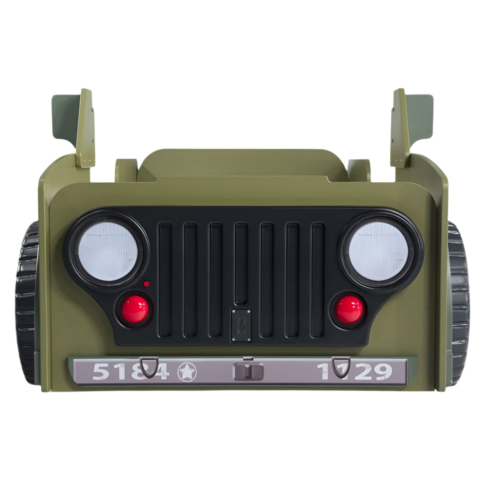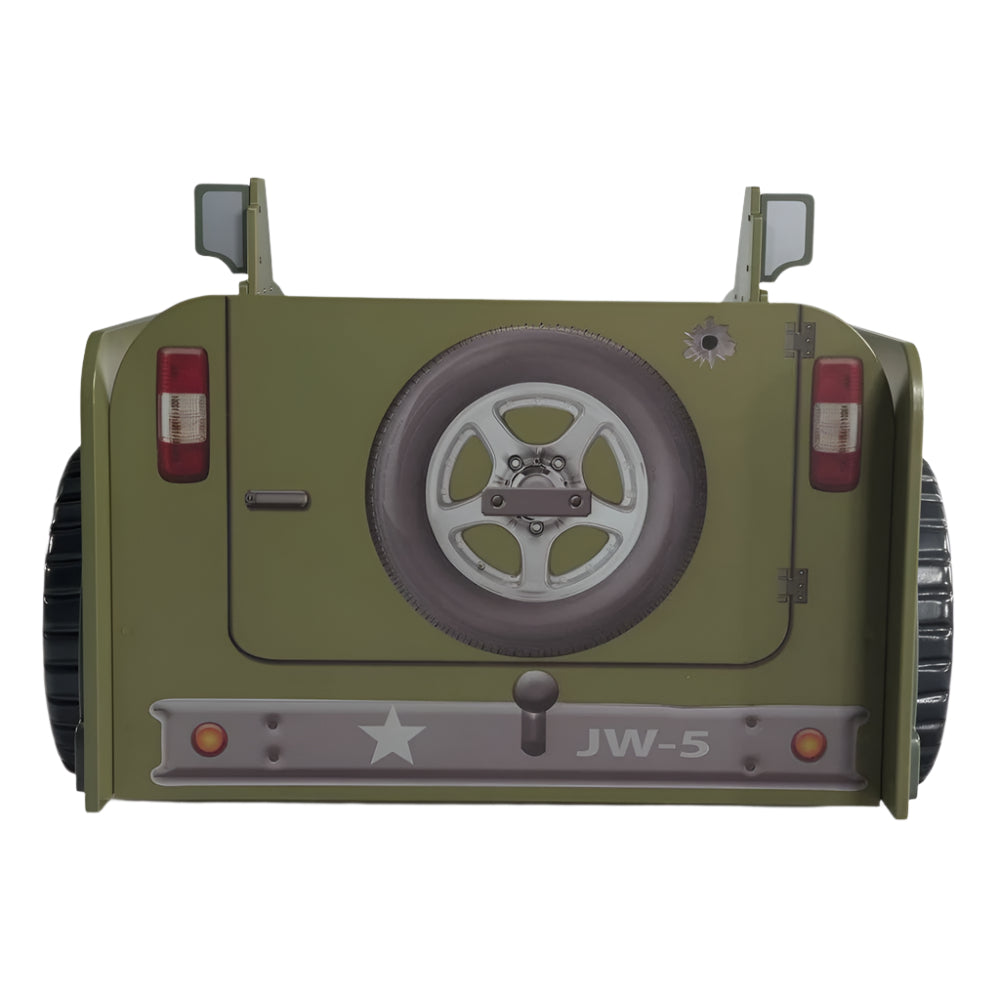 A Jeep egy egyedi ágy gyerekeknek, autót formázó kialakítással, vidám díszítéssel. Fényekkel - LED világítással felszerelt. Az ágy MDF lapból és akrilból készült részletekkel készült, matraccal együtt kerül kiszállításra. Matrac méretei: 190x90x10 cm (Hossz x Szélesség x Magasság).