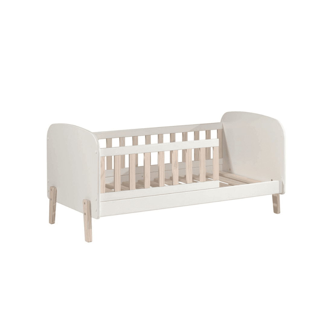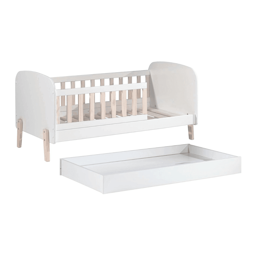 Ez a gyerekágy egy otthonos megjelenésű, biztonságos kisgyermek ágy, mely fehér színnel, illetve natúr fa részletekkel rendelkezik. Alacsony lábakon áll, és egy kis részt kivéve körbe van kerítve. A minimalista skandináv dizájnnak köszönhetően könnyedén illeszkedik bármilyen stílusú belső térbe. Az ágy az ágyrácsot is tartalmazza, melynek felülete 70x140cm, és tartozik hozzá egy kerekes, kihúzható ágyneműtartó, amely praktikus tárolási helyet biztosít.