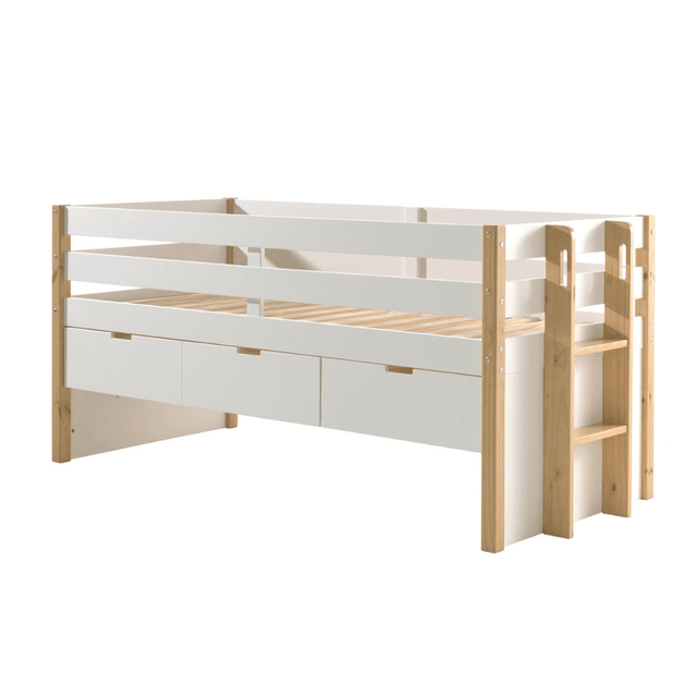 A Margrit gyerekágy egy letisztult, skandináv dizájn elemekkel rendelkező bútordarab, amely körbe biztonsági ráccsal van ellátva, és egy kis létrával van felszerelve. Fehérre lakkozott anyagát natúr színű tömör fenyő részletek egészítik ki, így könnyedén illeszkedik bármilyen enteriőrbe. A magasított ágy alatt három fiók található, és kiegészíthető még ágyneműtartóval is. A hozzá tartozó ágyrács mérete 90x200cm.