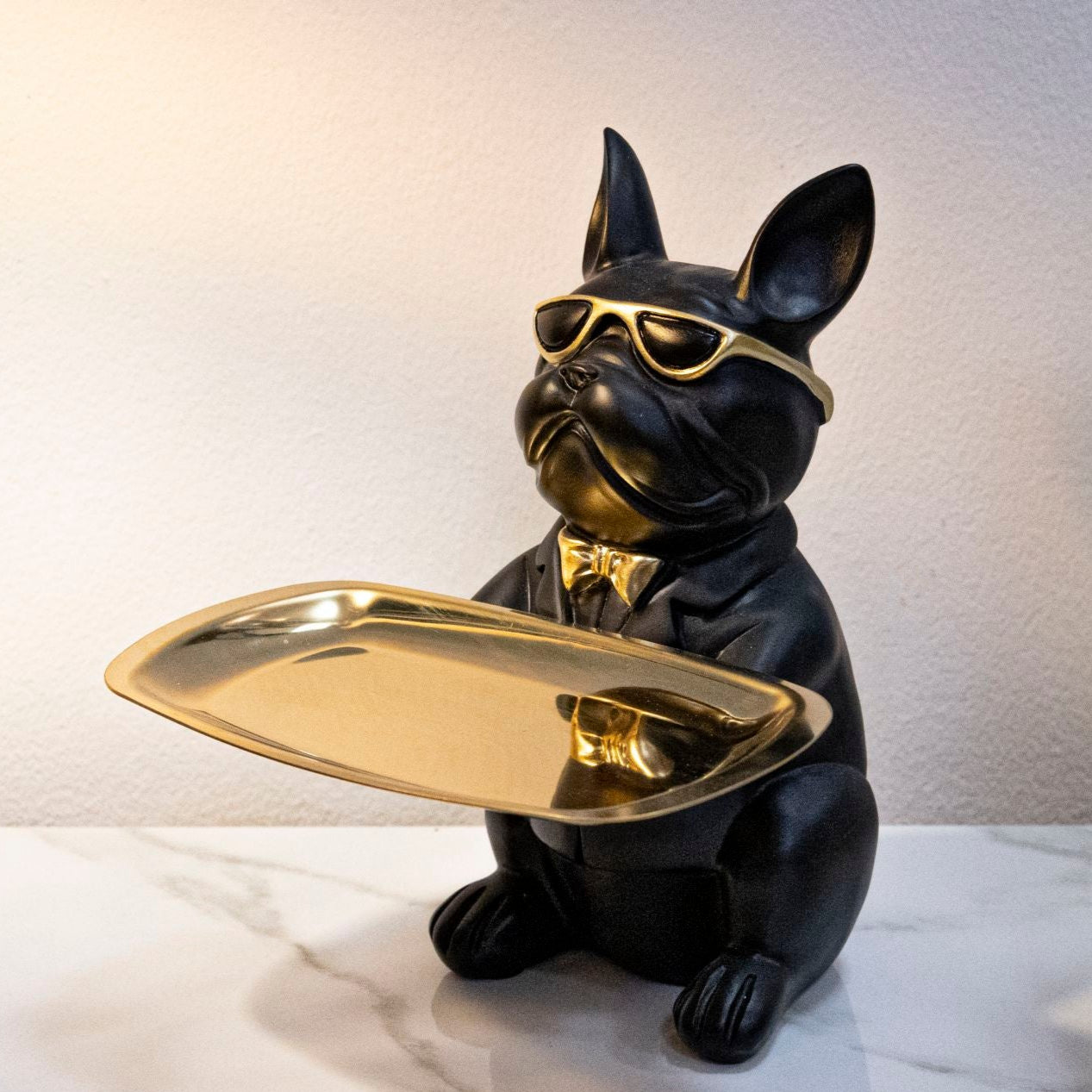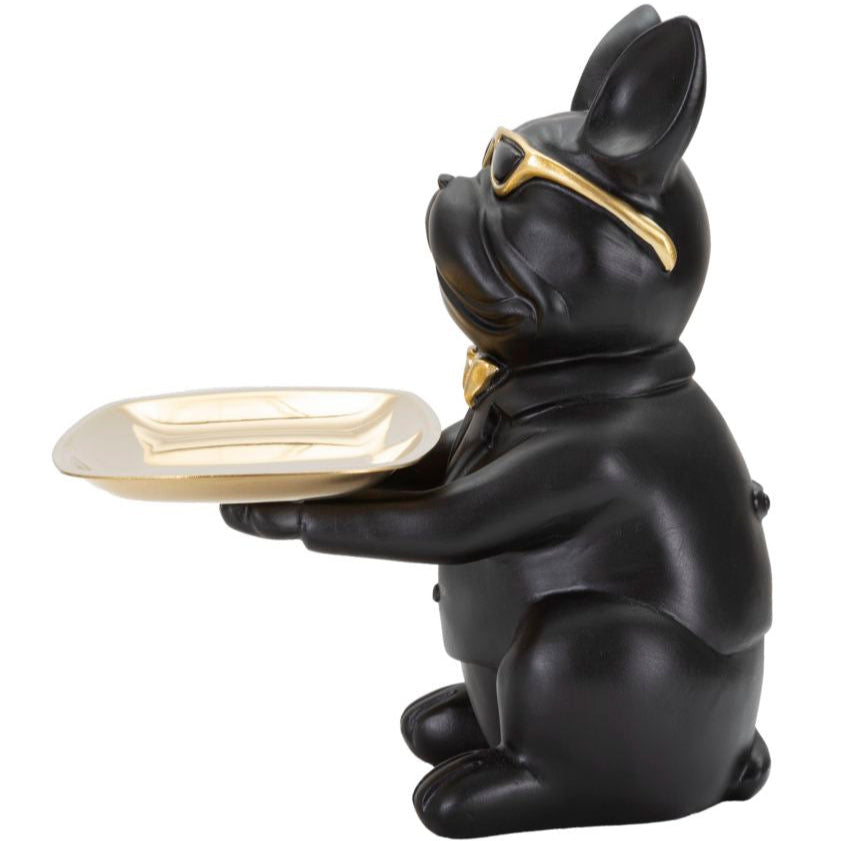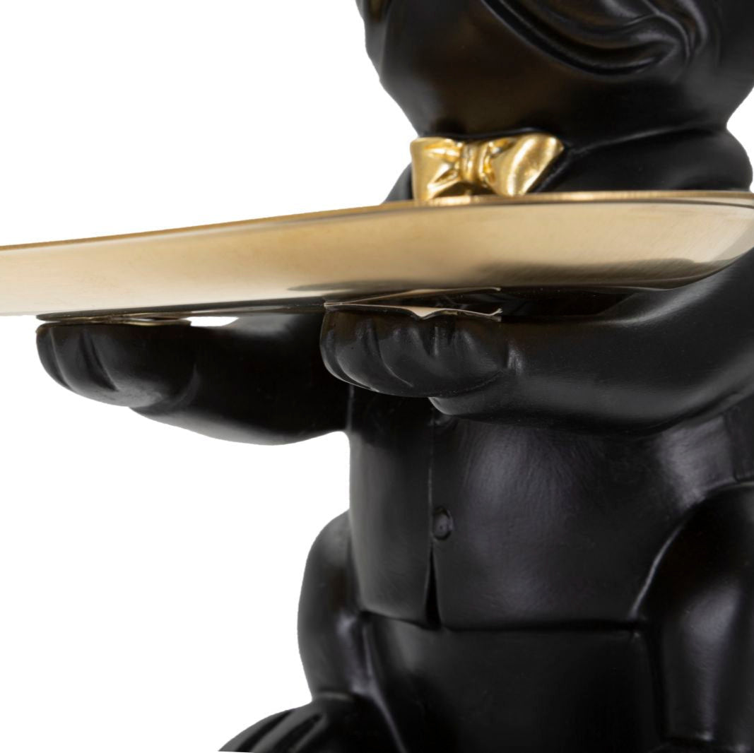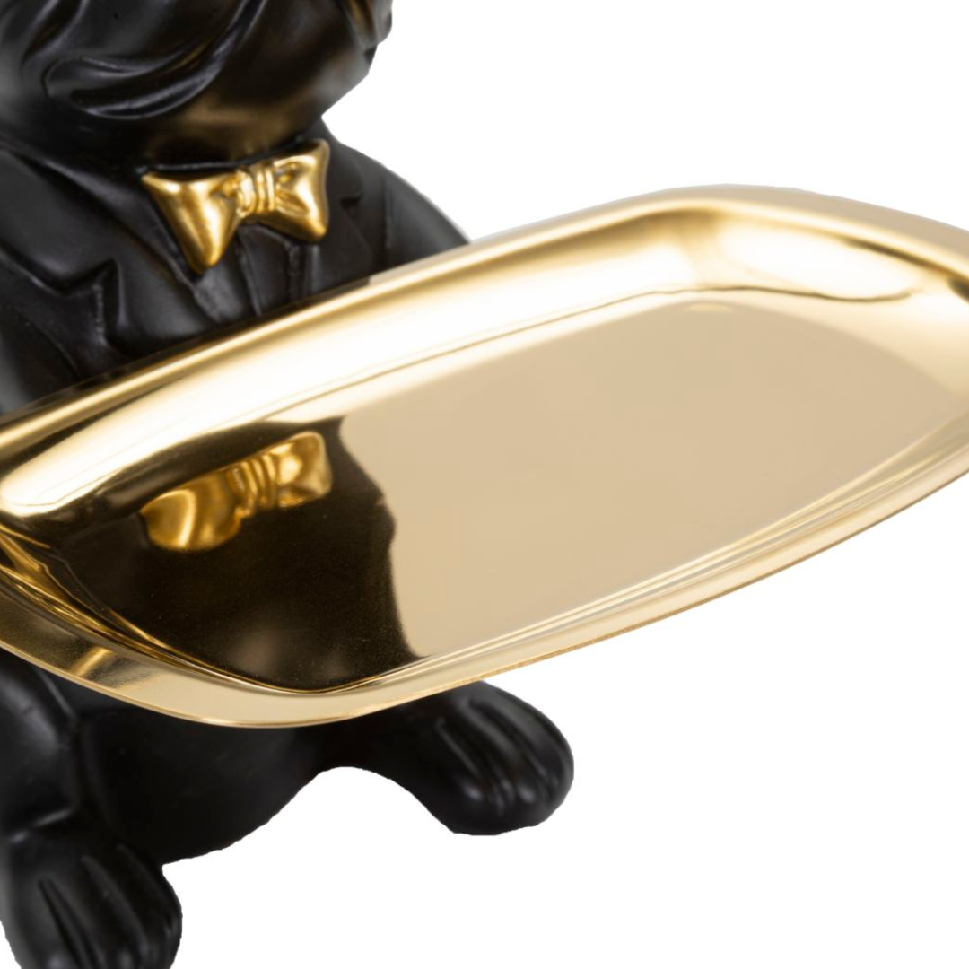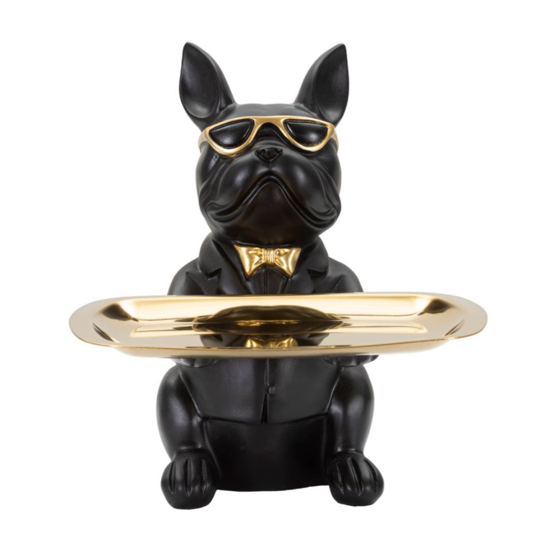 A Bull Dog egy egyedi, műgyantából készült szobor, ami különleges fekete és arany színű festést kapott illetve praktikus tálcát tart, amin tárolhatod kulcsaidat vagy egyéb kiegészítőidet. Extravagáns motívuma kiváló választás azoknak akiknek kedvencei kutyák vagy a Bulldogok. Igazán egyedi hatást kelt élethű, 3D kidolgozásával és különlegesen texturált arany színű részleteinek köszönhetően.