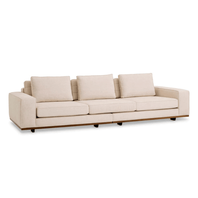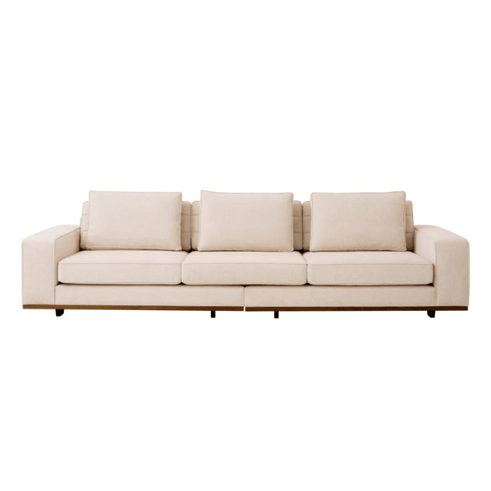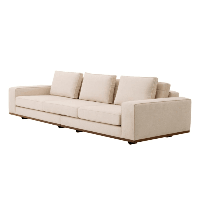 Az Aurora szövet kanapé a design és kényelem tökéletes találkozása. A kényelem fokozása érdekében a téglalap alakú kanapé háttámlája hat hátpárnával van kialakítva, amelyek közül három gombos tűzéssel készült, ami elegáns megjelenést kölcsönöz ennek a remek kanapénak. A bézs kárpitozást karcsú, kúpos barna fa lábak egészítik ki. Tökéletes választás, ha szeretnéd otthonodba csempészni a klasszikus elegancia és a kortárs stílus harmóniáját. Emellett a kanapé párnái nemcsak a látványt, hanem a kényelmet is fokozzák, így ideális hely a pihenéshez és a vendégek fogadásához.