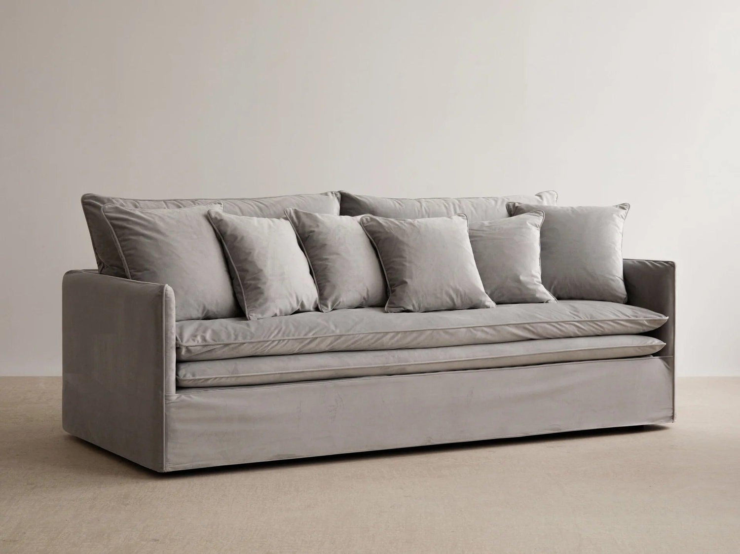 Boho 4 személyes bársony kanapé - Világosszürke utólagos megrendelésre kerül, és azonnal kiszállítjuk, amint újra raktáron van.