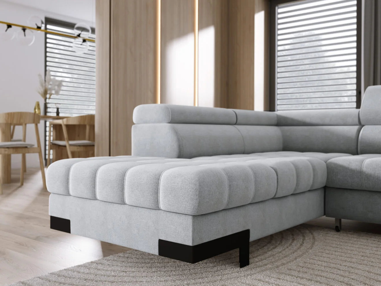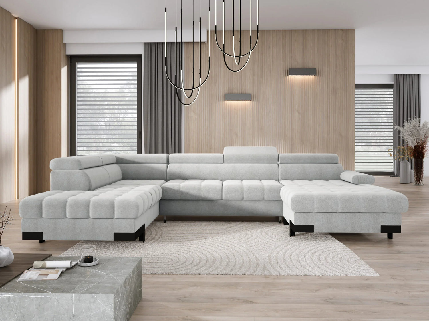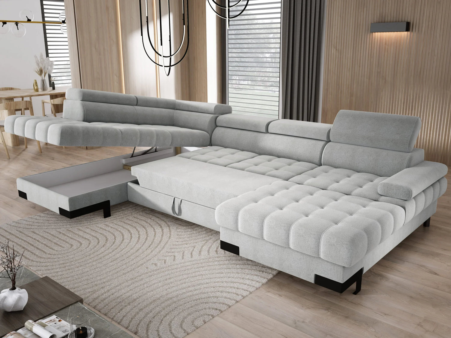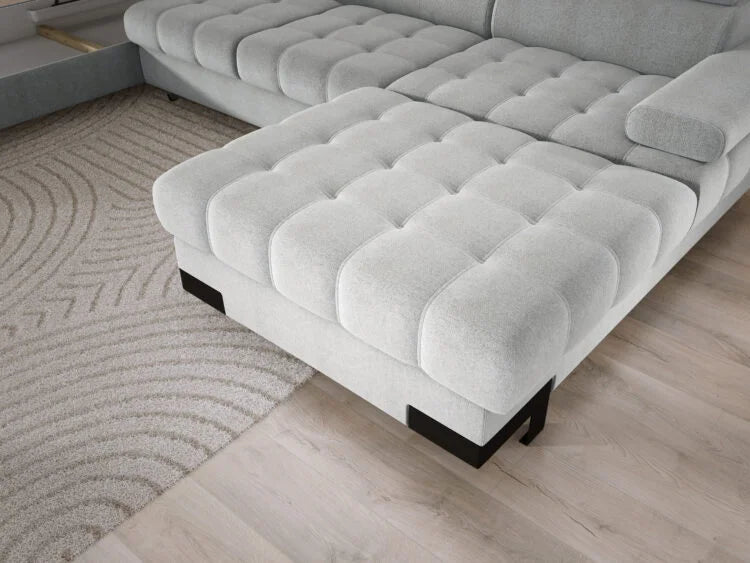 A Selva XL stílusával a legigényesebb otthoni pihenésre vágyókat is leveszi a lábáról. A tágas, U-alakú ülőfelületek, a modern dekoratív elemek, a megfelelően kontúrozott háttámlák és az állítható fejtámlák garantálják a legmagasabb szintű kikapcsolódást az egész család számára. A kényelmes, „delfin” típusú automata nyitórendszernek köszönhetően a kanapé pillanatok alatt kényelmes fekvőfelületté alakítható a váratlan vendégek számára, az ottománban található ágyneműtartó pedig praktikus tárolóhelyet biztosít a takarók és párnák számára.