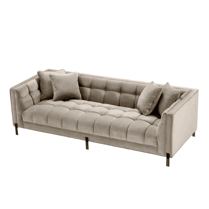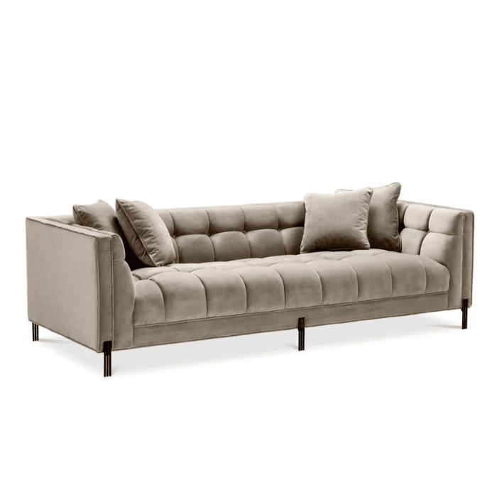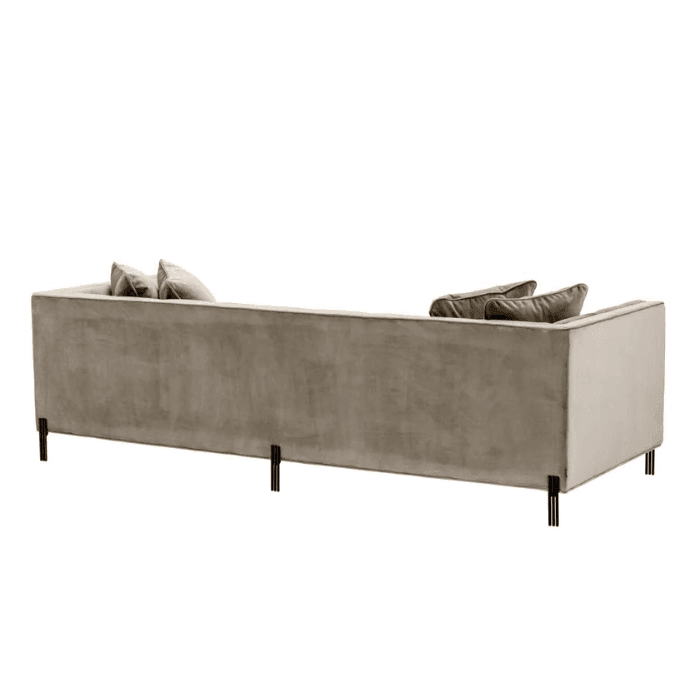 A Sienna bársony kanapé fekete lábbal a kényelem és a stílus remek párosítása. Ez a modern és elegáns fekvőalkalmatosság bársony kárpitozással készült. A négy négyzet alakú díszpárna fokozza a pazar hatását. A fekete bevonatú lábak pedig extra csillogást adnak luxus megjelenéséhez. A tökéletes összhatás érdekében kombináld az Eichholtz Sienna bársony kollekció lábtartójával, fotelével és padjával!