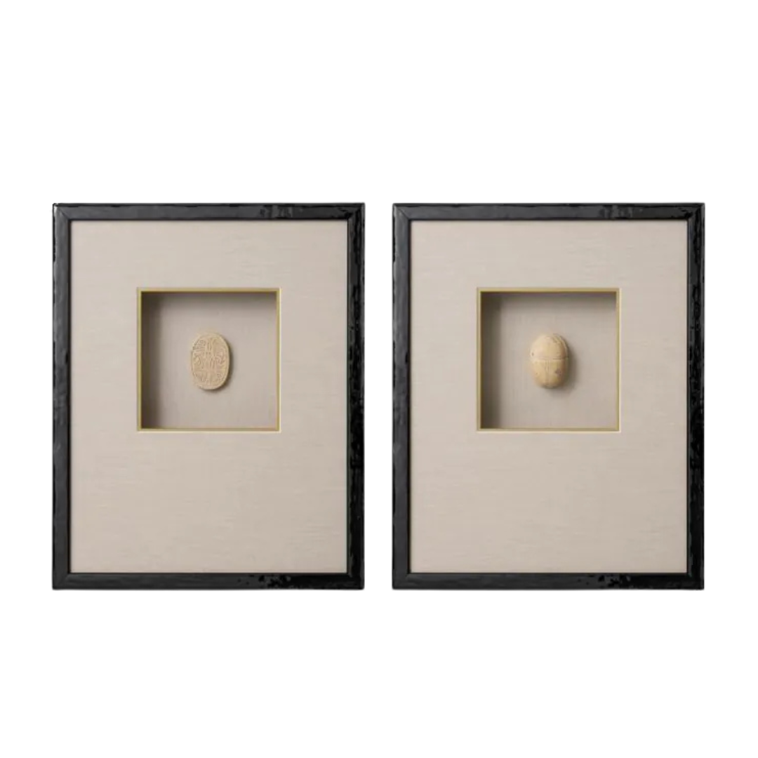 A Met x Eichholtz bemutatja az 'Inlay Menes' című alkotást, egy két darabból álló, bonyolult kerettel ellátott készletet, amely az ókori Egyiptom szimbolikus művészetét és gazdag építészeti örökségét idézi. Ezek a műalkotások Memphis, a királyság első fővárosának és szellemi központjának örökös örökségét ünneplik. Minden műalkotáson egy stilizált szkarabeusz látható, amely minimalista kompozícióba van illesztve, semleges háttér előtt, a maximális kontraszt és vizuális tisztaság érdekében. Az eredmény egy elegáns faldekoráció, amely összeköti az ókor és a modern design világát. A méret egy díszre értendő, a szett 2 falidíszt tartalmaz.