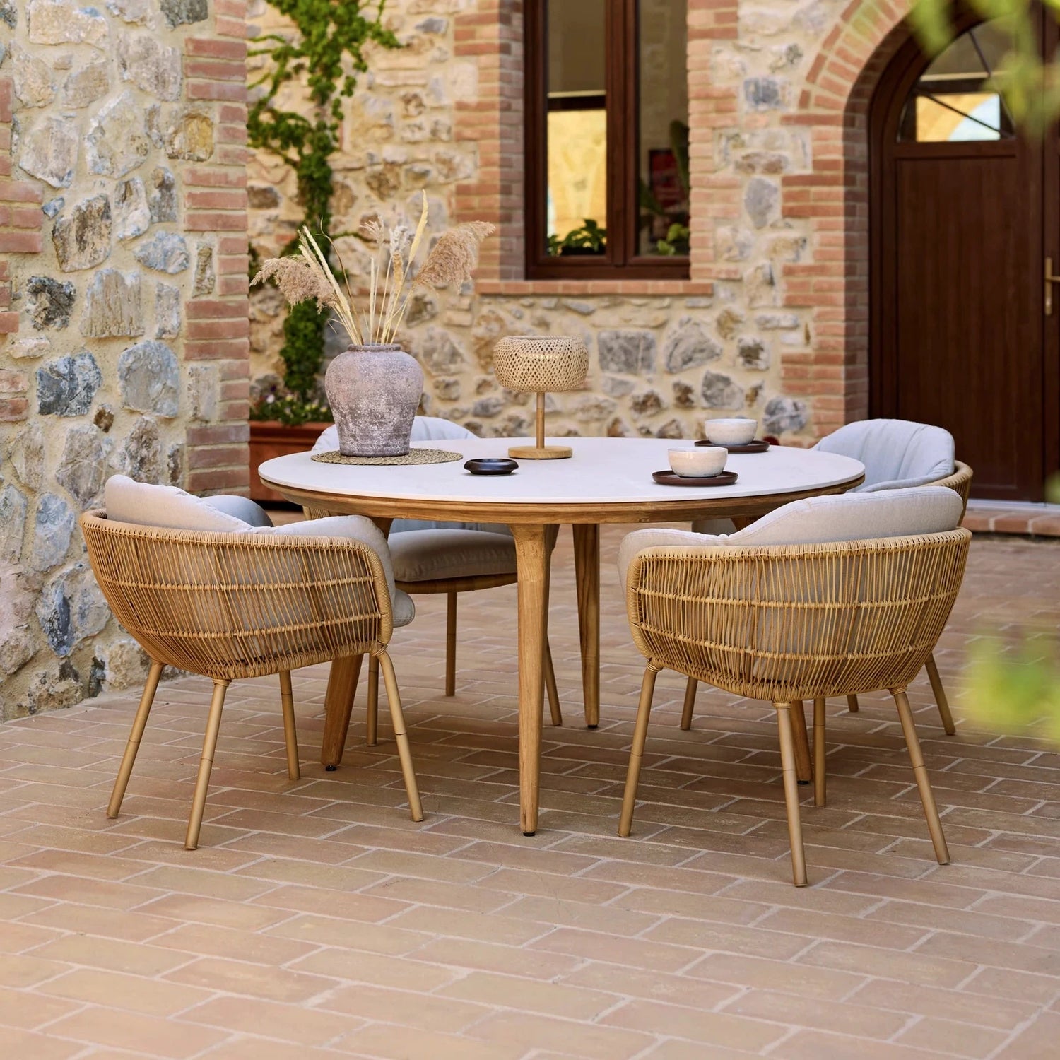 Az Aspect 144 cm átmérőjű kerti asztal kiemelkedő minőségű, tartós és gyönyörű anyagokból készült. A tíkfa váz ragyogása és melegsége ötvöződik a tiszta és tömör kerámiával. Az Aspectet a Cane-line Design tervezte, amely arra összpontosít, hogy egyedi asztalkollekciót alkosson, amely illeszkednek minden kültéri helyszínre. A Cane-line tíkfa az SVLK tanúsítási rendszer szerint jóváhagyott és termesztett.