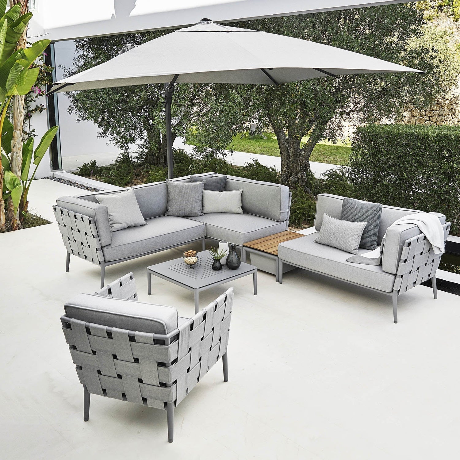 A Cane-line Conic pihenőgarnitúra olyan bútorokból áll, amelyeket úgy terveztek, hogy a lehető legkényelmesebbé tegyék a kültéri életet. A 332x222 cm-es sarokkanapé alkalmas a családdal és barátokkal eltöltött hosszú esték kikapcsolódására. A Conic kényelmes Cane-line szövetekből kapható, ezek mindegyike praktikus QuickDry & Airflow rendszerrel rendelkezik.