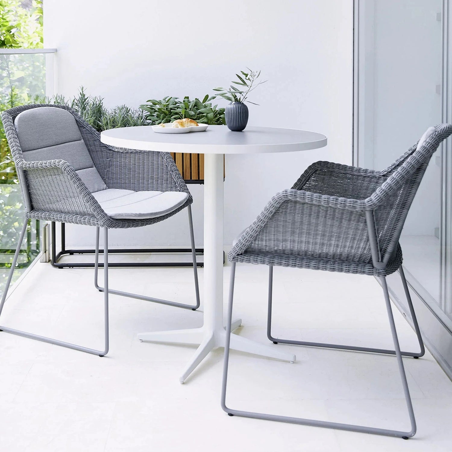 A 75 cm átmérőjű Drop kerti bisztró asztal a kerámia asztallapot az alumínium váz lágyabb formájával ötvözi. Ez teljesen új stílust kölcsönöz kültéri asztalainknak. A világosszürke asztallap rugalmas és nyers felületet alkot, amelyet az északi életstílus ihletett, és amelynek célja egy stílusos, mégis ellenálló asztal megtervezése.