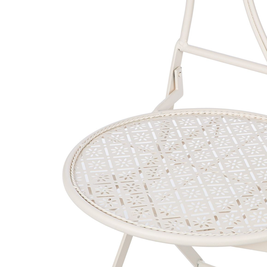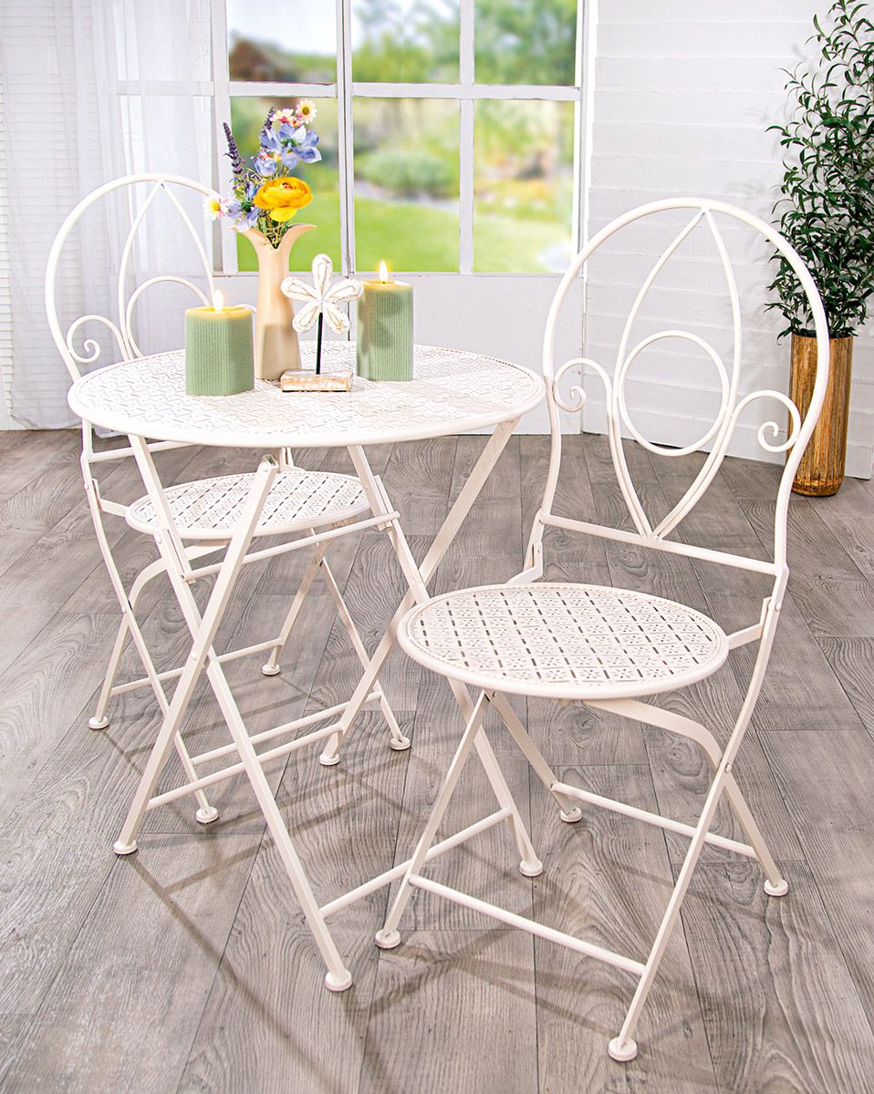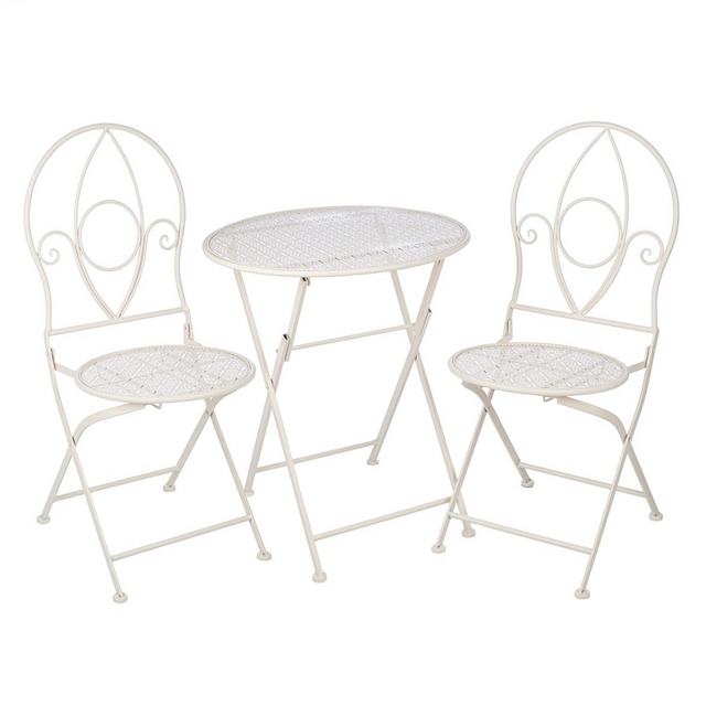 A Floral egy elegáns fehér fém bisztró szett ami ötvözi a funkcionalitást a dekoratív bájjal, így tökéletes kiegészítője lehet mind a beltéri, mind a kültéri tereknek. Porszórt fémből készült, így a tartósság érdekében tervezték. Virágmotívumokat tartalmaz kecsesen ívelt fémszerkezettel ellátott háttámláján, ami egy kis vintage eleganciát ad ennek a szettnek. Ideális kertekbe, teraszokra, nappalikba vagy erkélyekre, romantikus és időtlen esztétikájával bármilyen teret feldob. A szett tartalma 2 darab összecsukható szék és 1 darab összecsukható asztal.