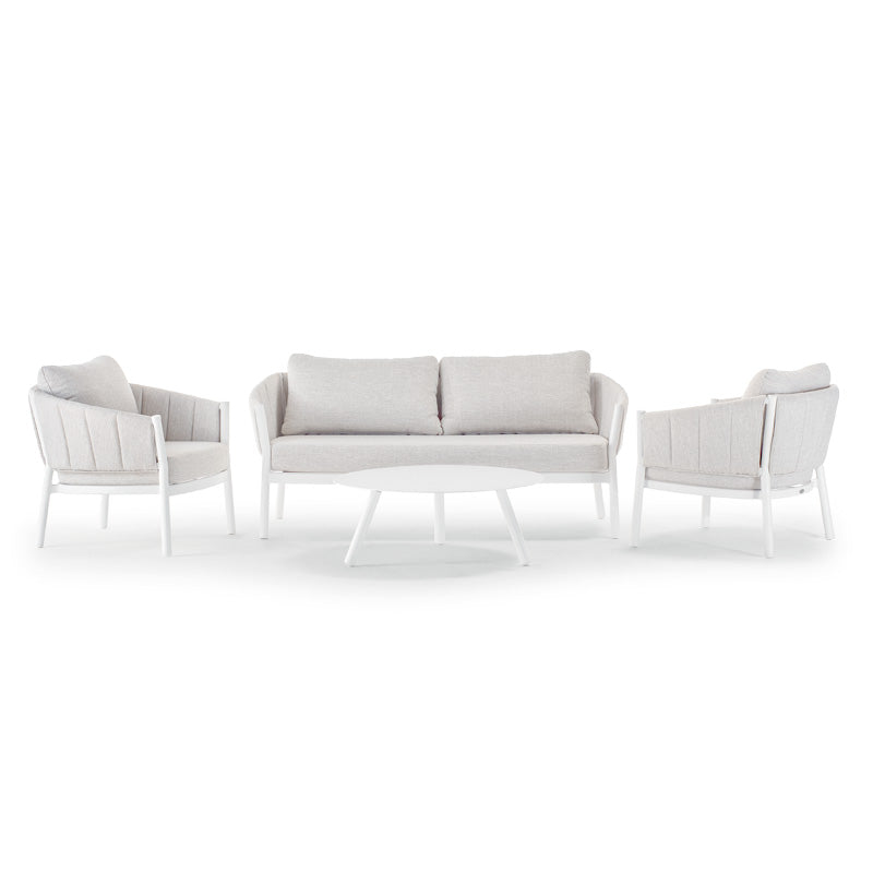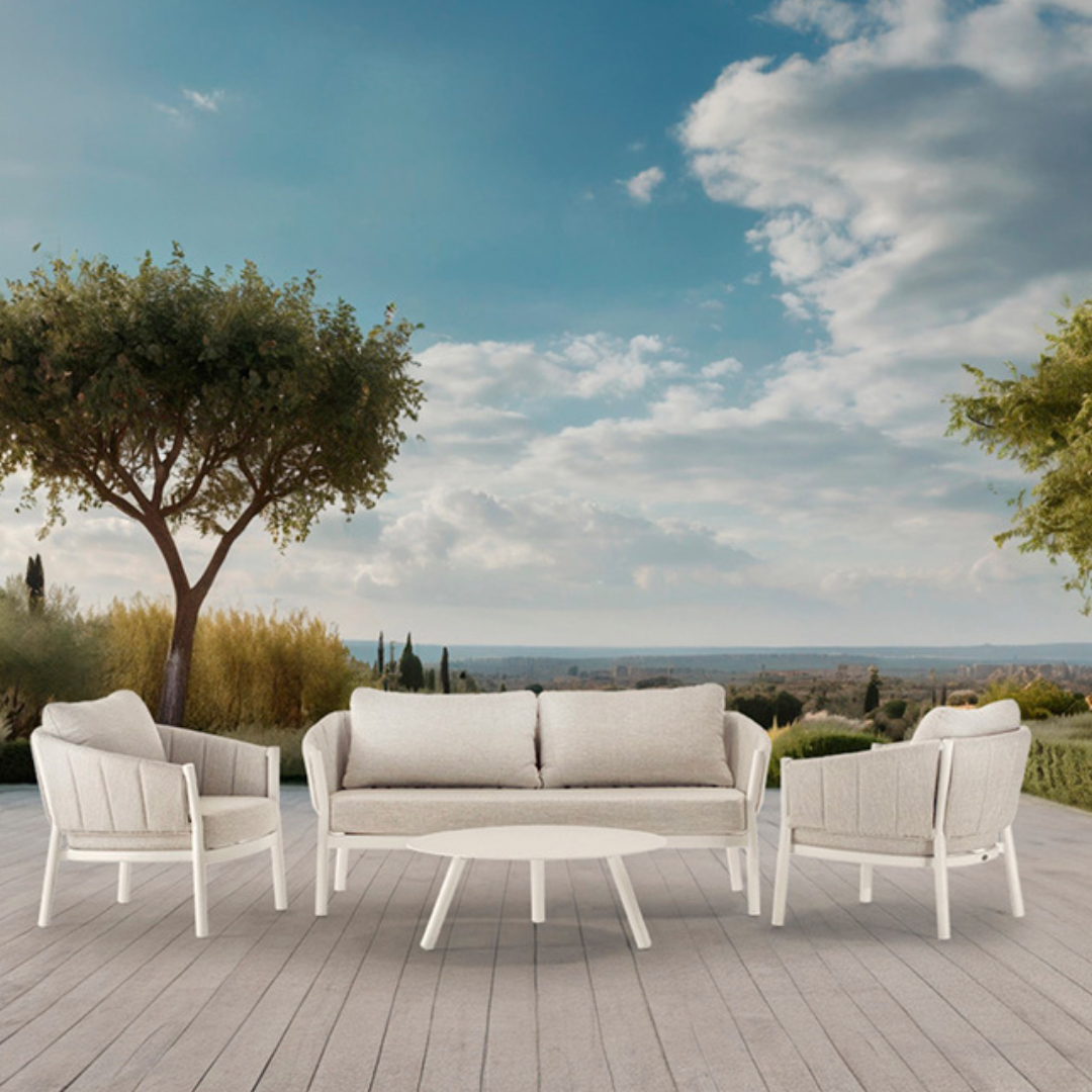 A Grid kerti kanapé szett egy modern megjelenésű, elegáns bútor, mely ragyogó fehér vázzal és kellemes világosszürke párnákkal kapható. Ideális választás kertekbe, teraszokra, vagy akár nagyobb erkélyekre is. A szett tartalmaz egy kényelmes 2 személyes kanapét, két fotelt, a hozzájuk tartozó ülőpárnákat, és egy praktikus asztalt, mely tökéletes helyet biztosít az italoknak, vagy egy kis harapnivalónak. Méretek: kanapé 175x80x71 cm, fotel 85x80x71 cm, asztal Ø90x35 cm.