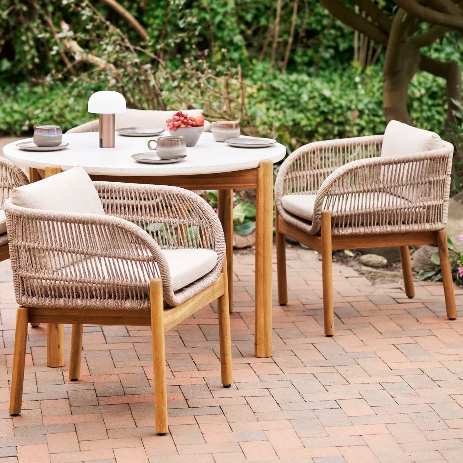 A Terracina étkező szett a stílus és kényelem tökéletes egyensúlyát kínálja. A készletben található bútorok natúr fa lábai elegáns megjelenést biztosítanak. A székek (63x64x70 cm) fém vázát fonott kötél borítja, és vastag, puha szövet párnák garantálják a maximális komfortot. A szett része egy 120x120x76 cm-es étkezőasztal is, mely műkő asztallappal rendelkezik.