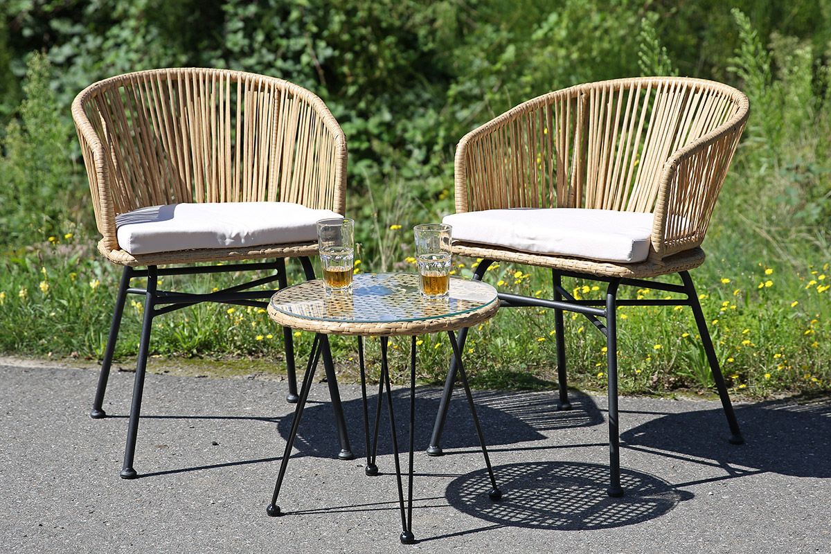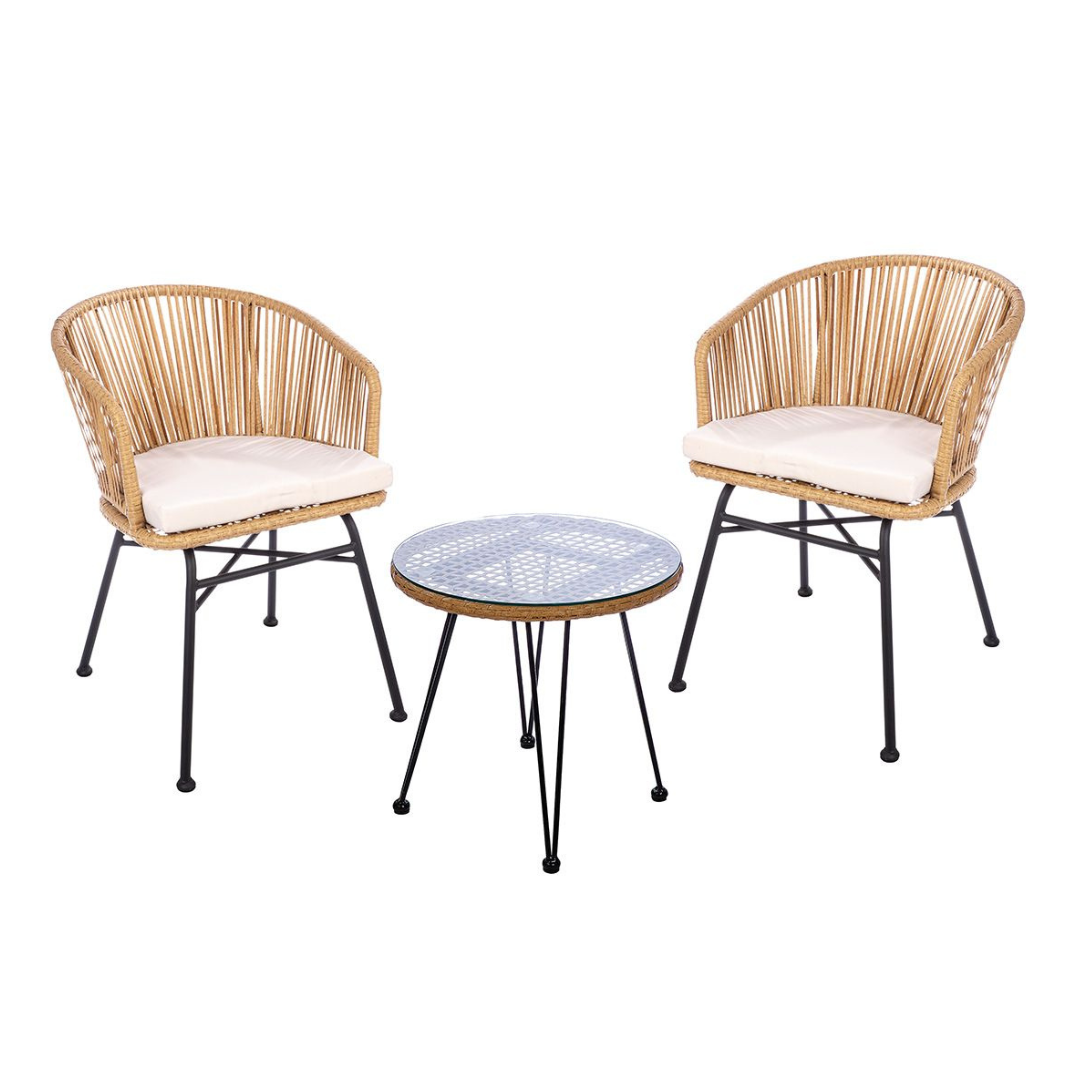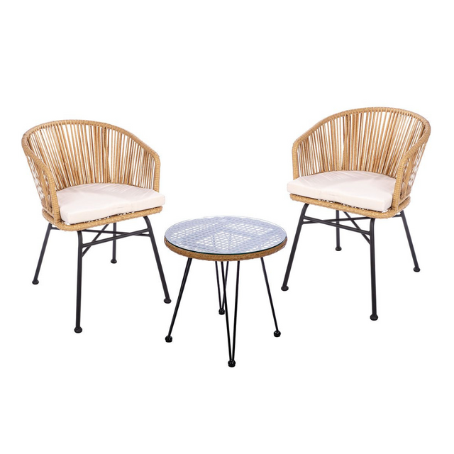 A Valencia egy modern és romantikus hangulatot teremtő, natúr színű műrattanból készült kerti ülőgarnitúra szett, amihez 2 szék (68x54x77cm) és egy dohányzóasztal tartozik. Fém szerkezetét időjárásnak ellenálló műrattan üléssel és vízálló huzattal rendelkező párnákkal látták el, ami amellett, hogy látványos, kényelmes pihenést biztosít. A dohányzóasztal lapja üveggel van ellátva.