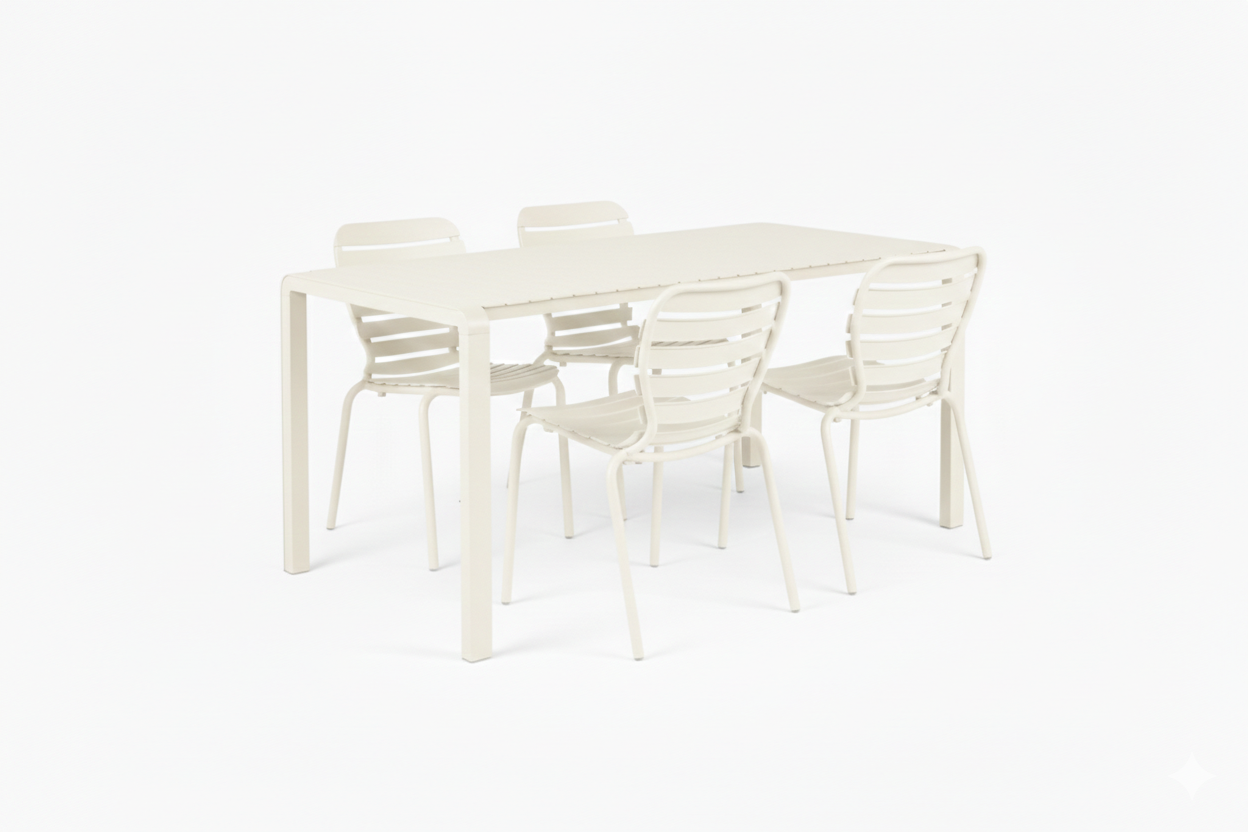 A Vondel kerti szett a stílusos kültéri élet és a gondozásmentes tartósság jegyében született. A teljes egészében erős és időjárásálló, fehér porszórt alumíniumból készült garnitúra okos, rácsos kialakítása lehetővé teszi a csapadék gyors elvezetését, így a bútorok az eső után pillanatok alatt újra használhatóvá válnak. A szett egy 168,5 cm hosszú asztalból és négy ergonomikus, karfa nélküli székből áll, amelyek tökéletes keretet biztosítanak a hangulatos kerti vacsorákhoz vagy egy napsütéses reggeli kávézáshoz. Időtlen formavilága és elegáns megjelenése nívós karaktert kölcsönöz a kisebb teraszoknak is, miközben az anyaghasználat garantálja a széllel és napsütéssel szembeni ellenállást szezonról szezonra.