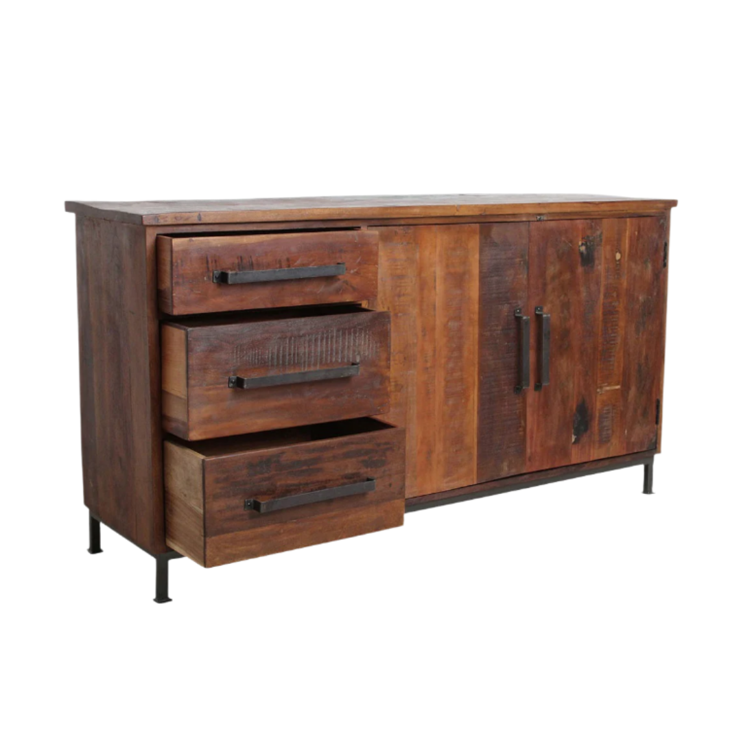 Fa komód a Factory kollekcióból, 2 ajtóval és 3 fiókkal. Ez a szekrény ideális olyan tárgyak tárolására, mint például az étkészleted, könyveid vagy ruháid. Helyezz a szekrényre egy gyönyörű növényt, és azonnal igazi látványosság lesz a nappalidban! A Factory kollekció 100%-ban újrahasznosított fából készült. A fa régi házakból származik, amelyeket lebontott, elhagyott gyárakból, padlódeszkákból, fali panelekből és tetőszerkezetekből származik. A fa sötétebb árnyalattal rendelkezik az évek óta tartó használat miatt.