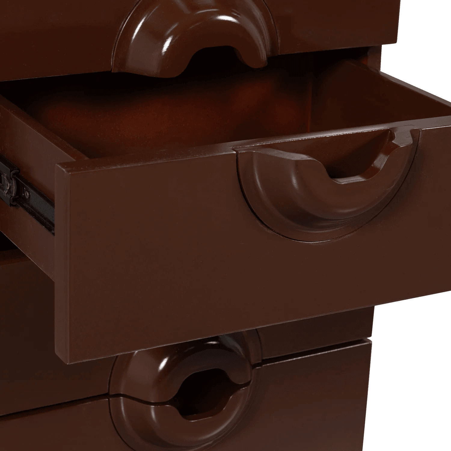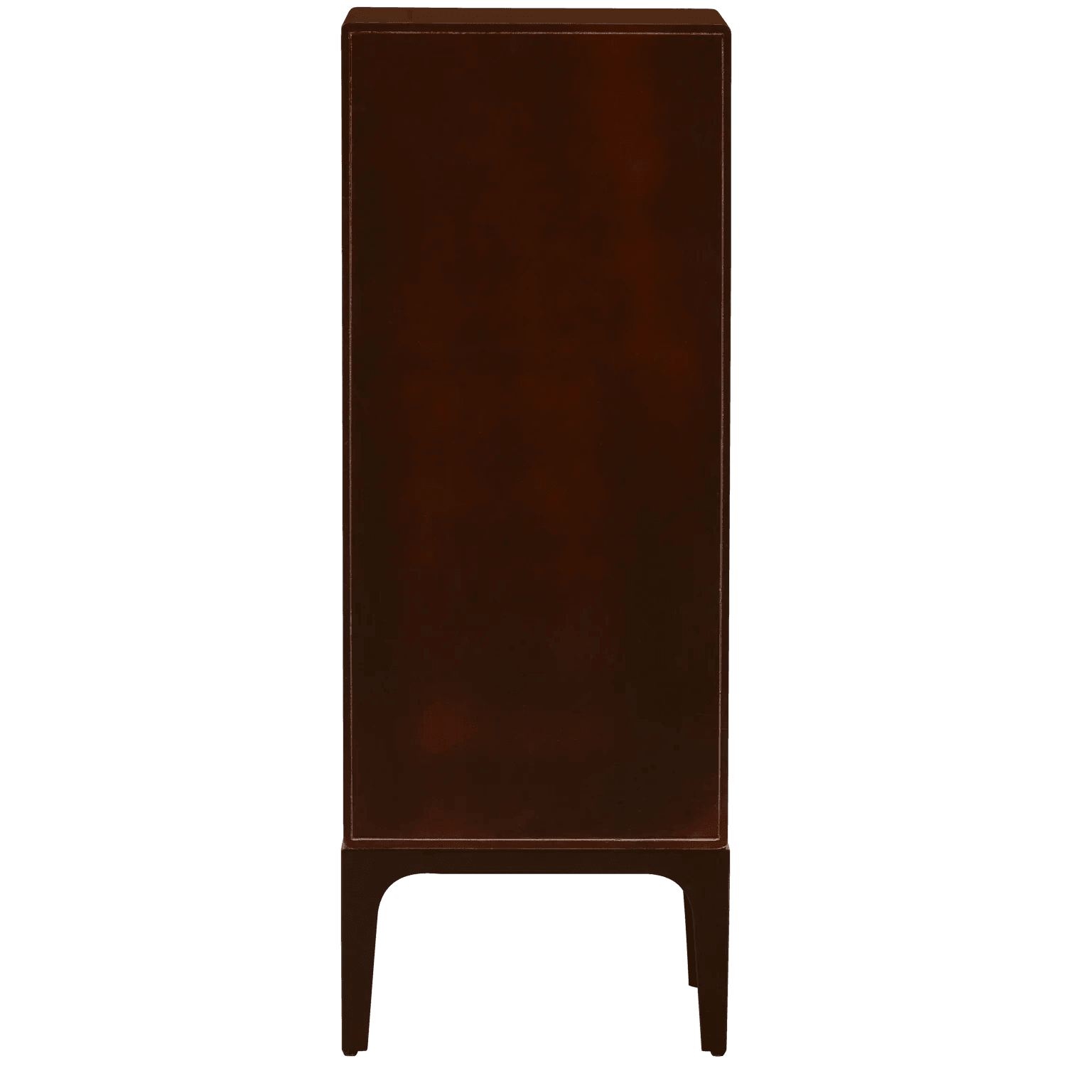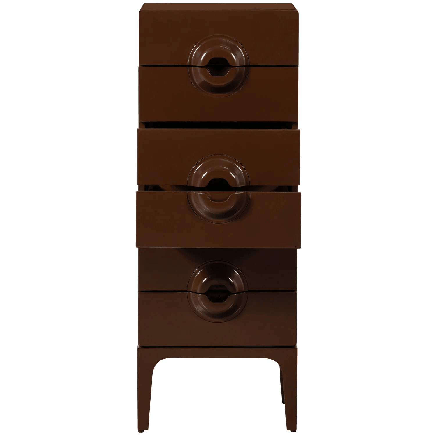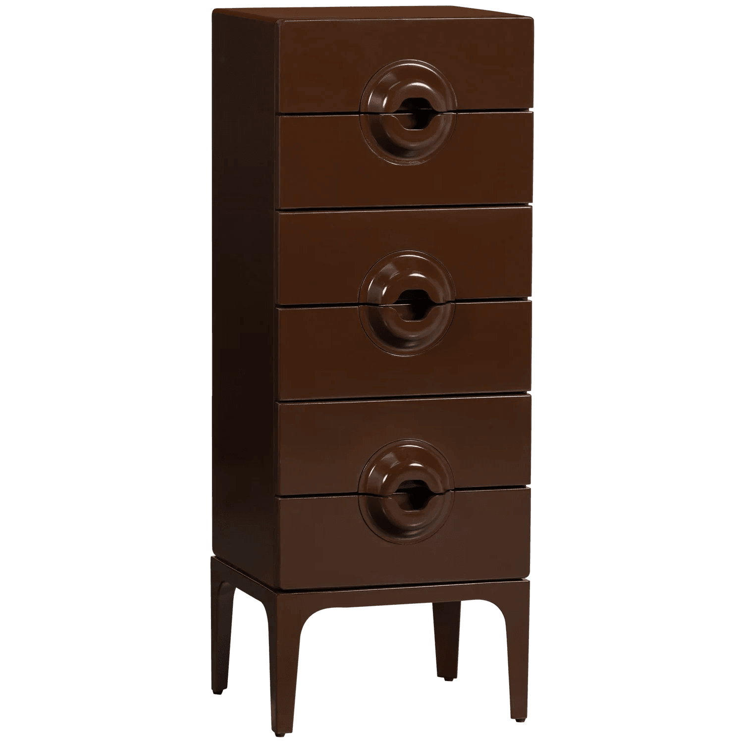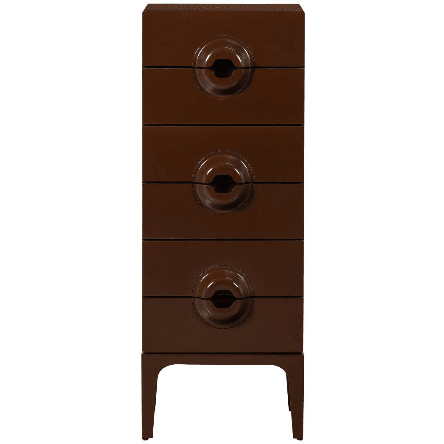 A Merge egy retro dizájnnal rendelkező komód, mely a Woood márka kollekciójából származik. Ez a sötétbarnára lakkozott bútor hat tágas fiókkal rendelkezik, amelyek mindegyike egyedi kialakítású fogantyúval van ellátva, a könnyű kinyitás érdekében. Sok helyet kínál a különféle tárgyak rendezett elhelyezésére, megjelenése miatt pedig jól illeszkedik a klasszikus belső terekbe.