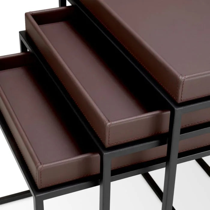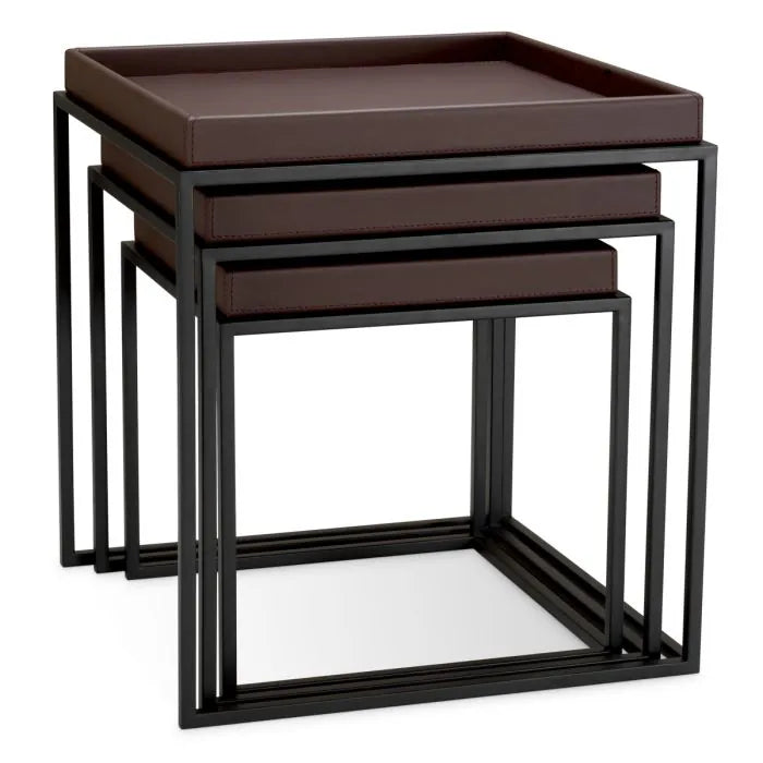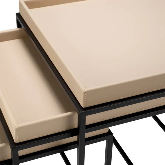 Fedezze fel az Eichholtz Léonard lerakóasztal-szettet, ahol a modern matt fekete váz és a texturált műbőr felület találkozása teremt időtlen eleganciát. Ez a sokoldalú, három darabból álló készlet rugalmas és kifinomult megoldást kínál nappalijába: az asztalok együtt, egymásba tolva vagy a helyiség különböző pontjain külön-külön is elhelyezhetők. A finom műbőr borítás és a robusztus fémszerkezet kontrasztja a szettet bármely prémium enteriőr meghatározó fókuszpontjává teszi.