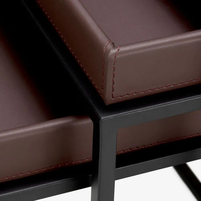 Az asztalok váza masszív fémből készült, amely elegáns fekete finiselést (black finish) kapott. Az asztallapok különlegessége a prémium műbőr (faux leather) borítás, amely egyszerre nyújt luxus megjelenést és tartós használatot. A szett kizárólag beltéri, száraz helyiségekben való használatra készült.