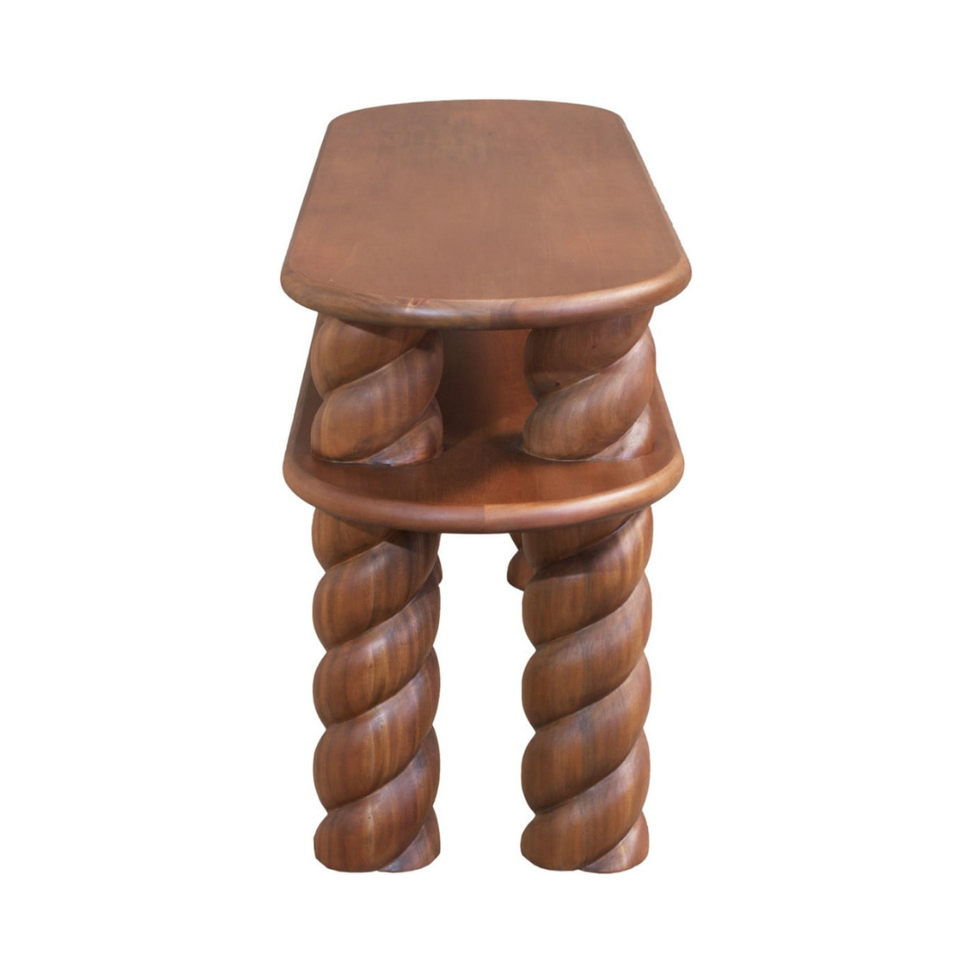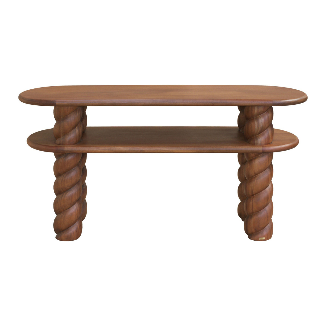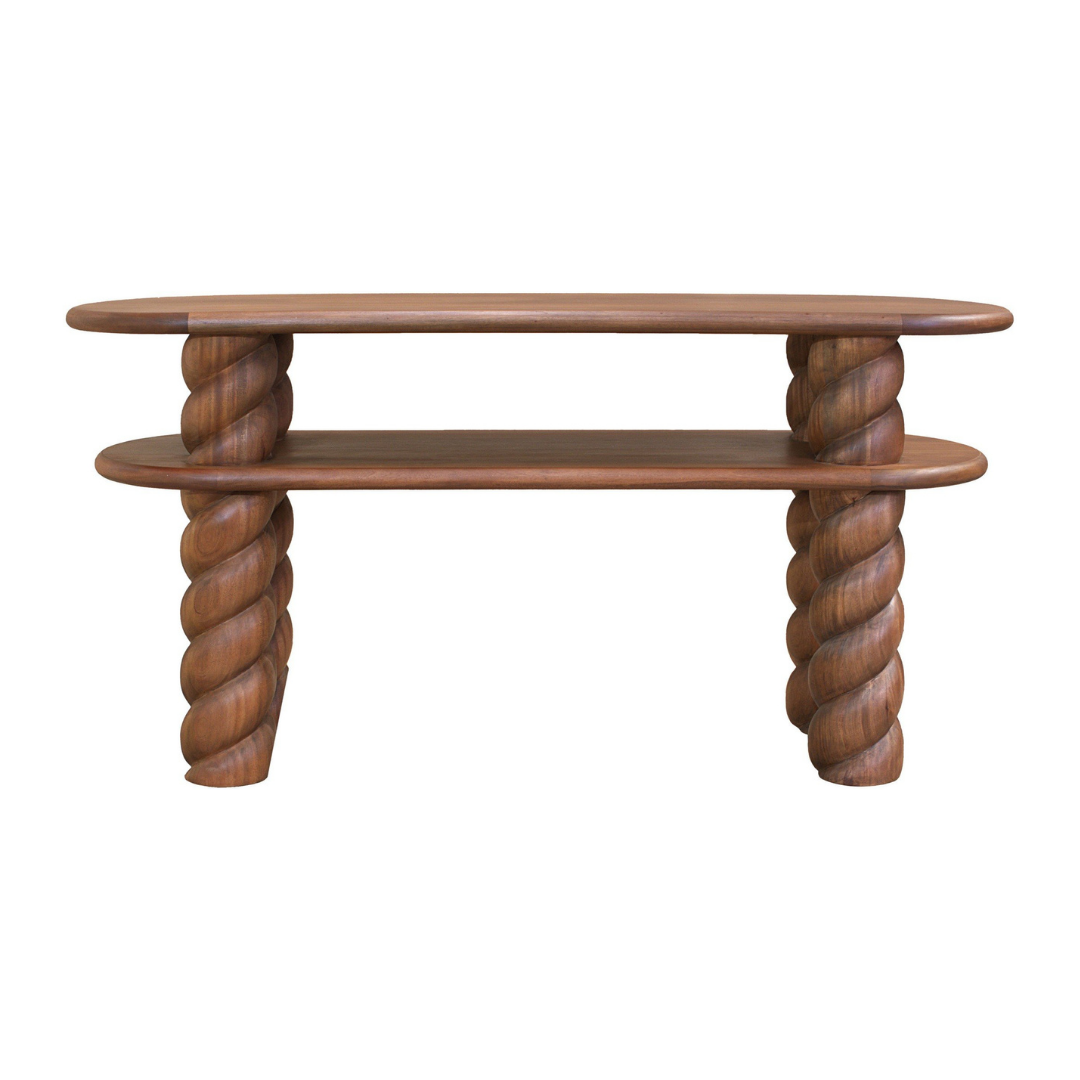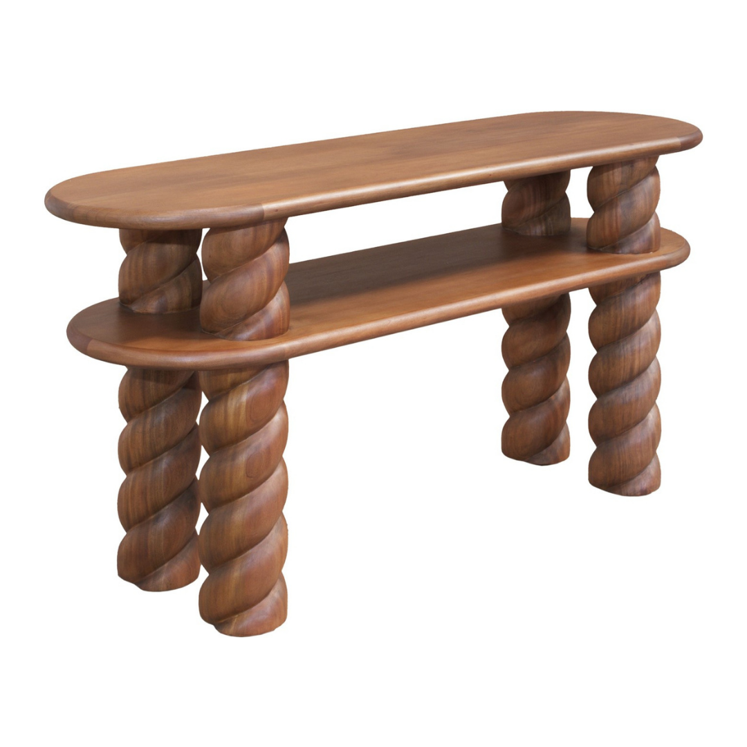 A Nami konzolasztal egy elegáns bútordarab, amely ötvözi a klasszikus elemeket a modern formákkal. A natúr színű mahagónifa tartós és természetes, így tökéletesen illeszkedik bármilyen enteriőrbe. Az ovális asztallap, valamint a polc praktikus használatot nyújtanak, míg a csavarosan faragott lábak stílusos hatást kölcsönöznek.