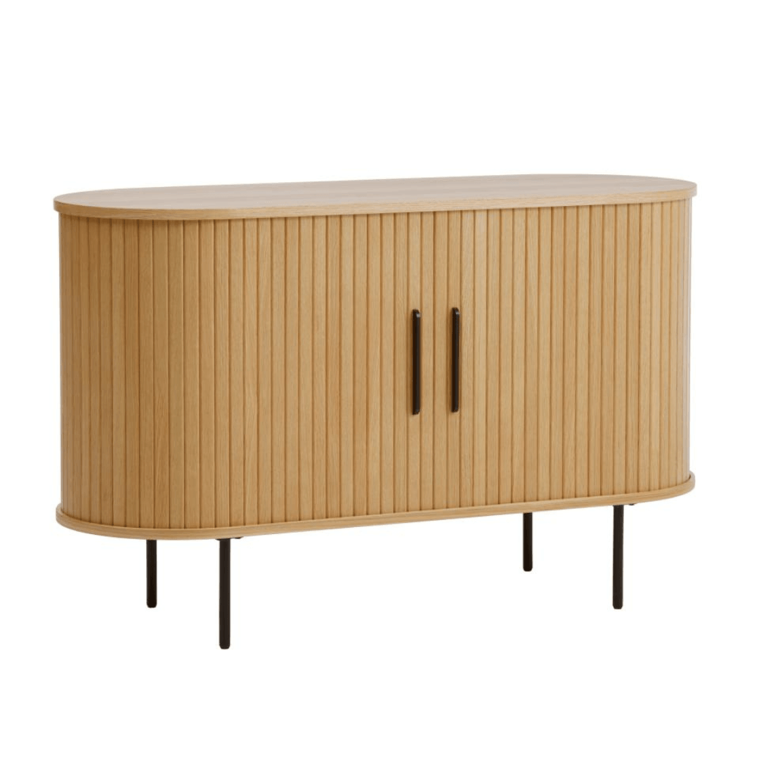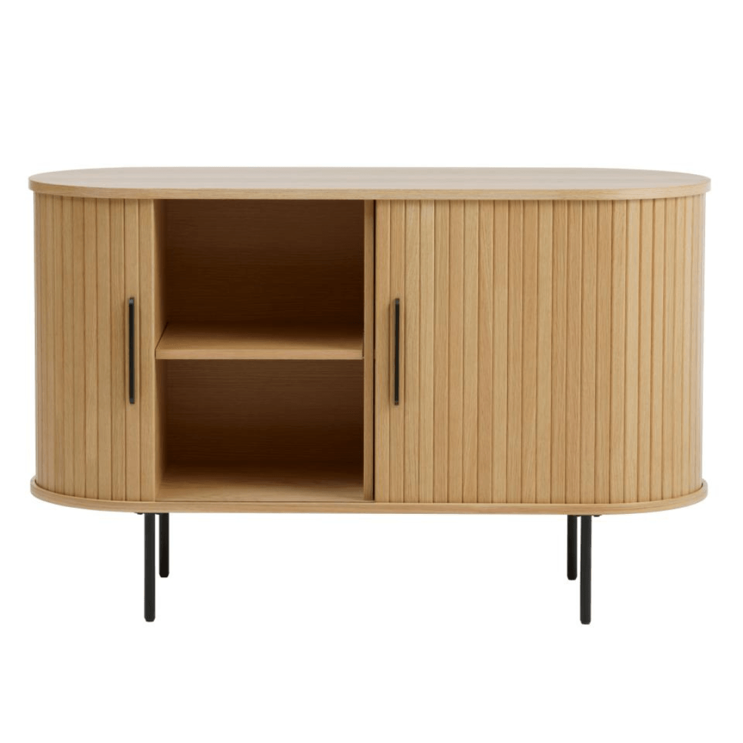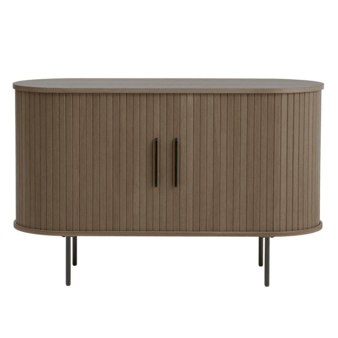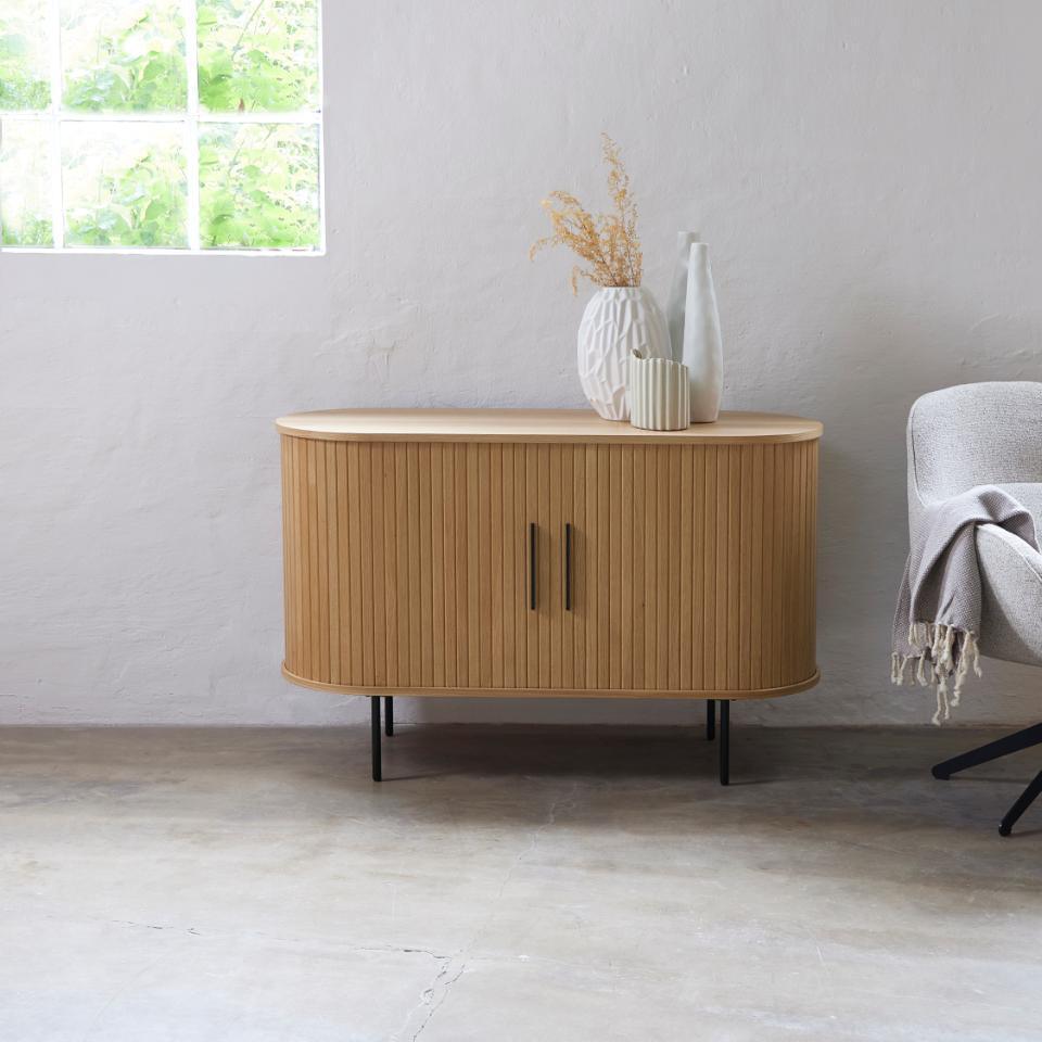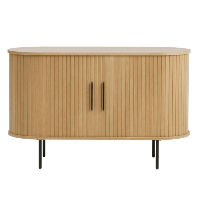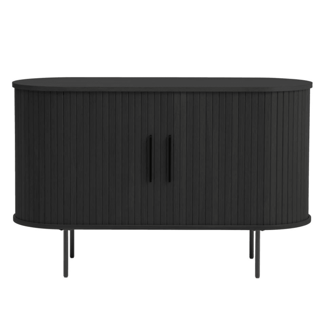 A komód anyaga festett tölgy furnér, míg a lábai fekete festett fémek, amelyek egyedülálló stílust kölcsönöznek neki. A tolóajtók praktikus megoldást nyújtanak a tárolásra, így nem kell aggódnia a nyitásuk miatt. A komód méretei ideálisak a kisebb helyiségekbe is, így bármely szobában jól mutat. Ez a komód tökéletes kombinációja a funkcionalitásnak és a dizájnnak.