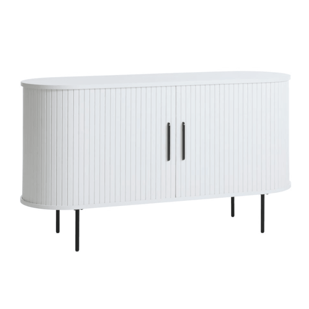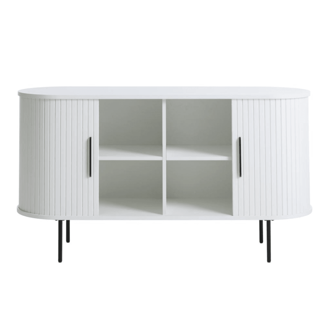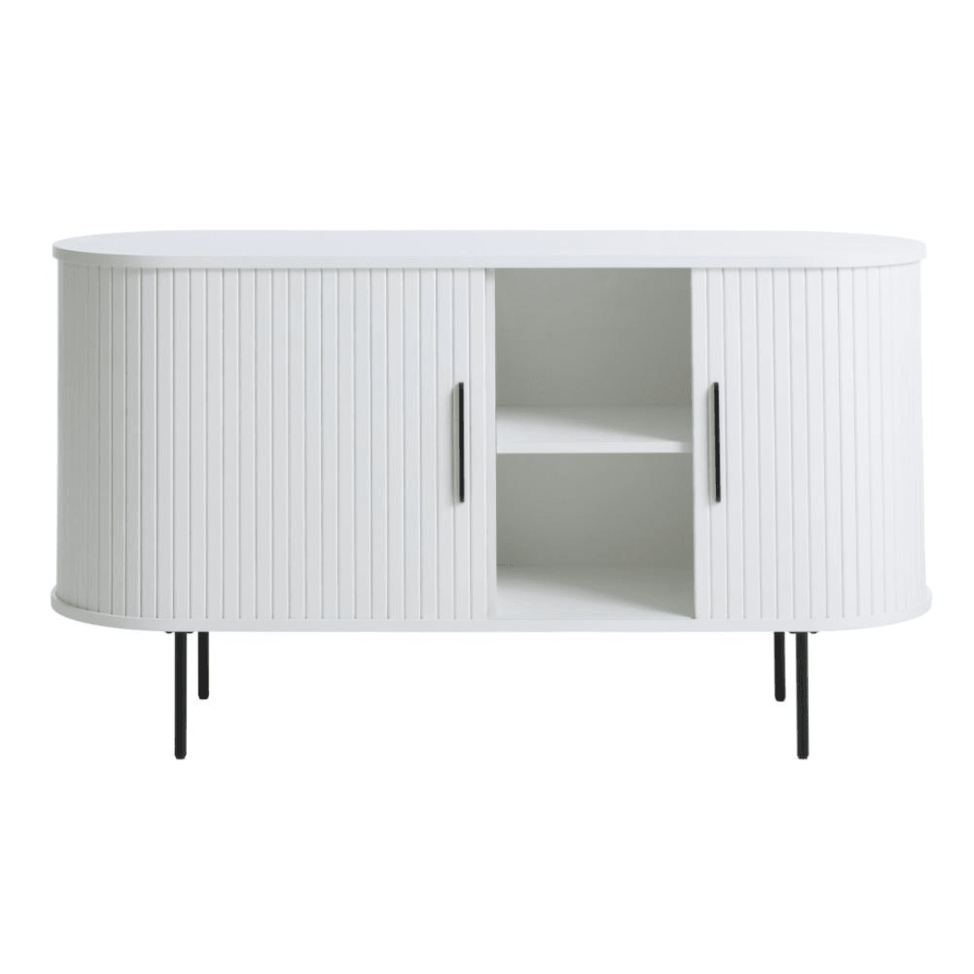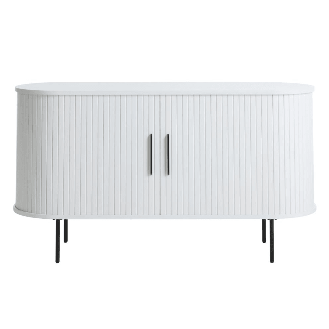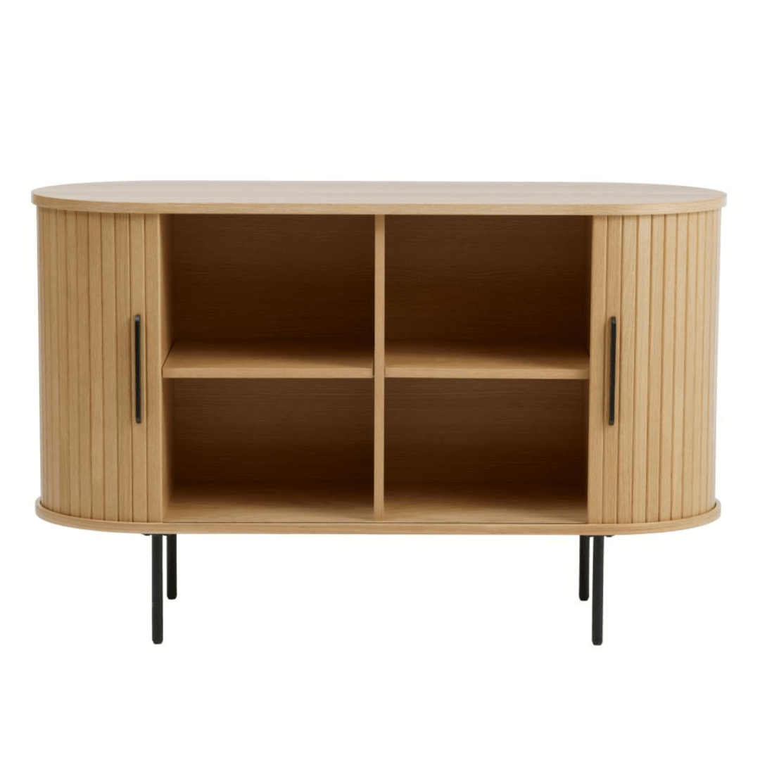 A komód anyaga festett tölgy furnér, míg a lábai fekete festett fémek, amelyek egyedülálló stílust kölcsönöznek neki. A tolóajtók praktikus megoldást nyújtanak a tárolásra, így nem kell aggódnia a nyitásuk miatt. A komód méretei ideálisak a kisebb helyiségekbe is, így bármely szobában jól mutat. Ez a komód tökéletes kombinációja a funkcionalitásnak és a dizájnnak.