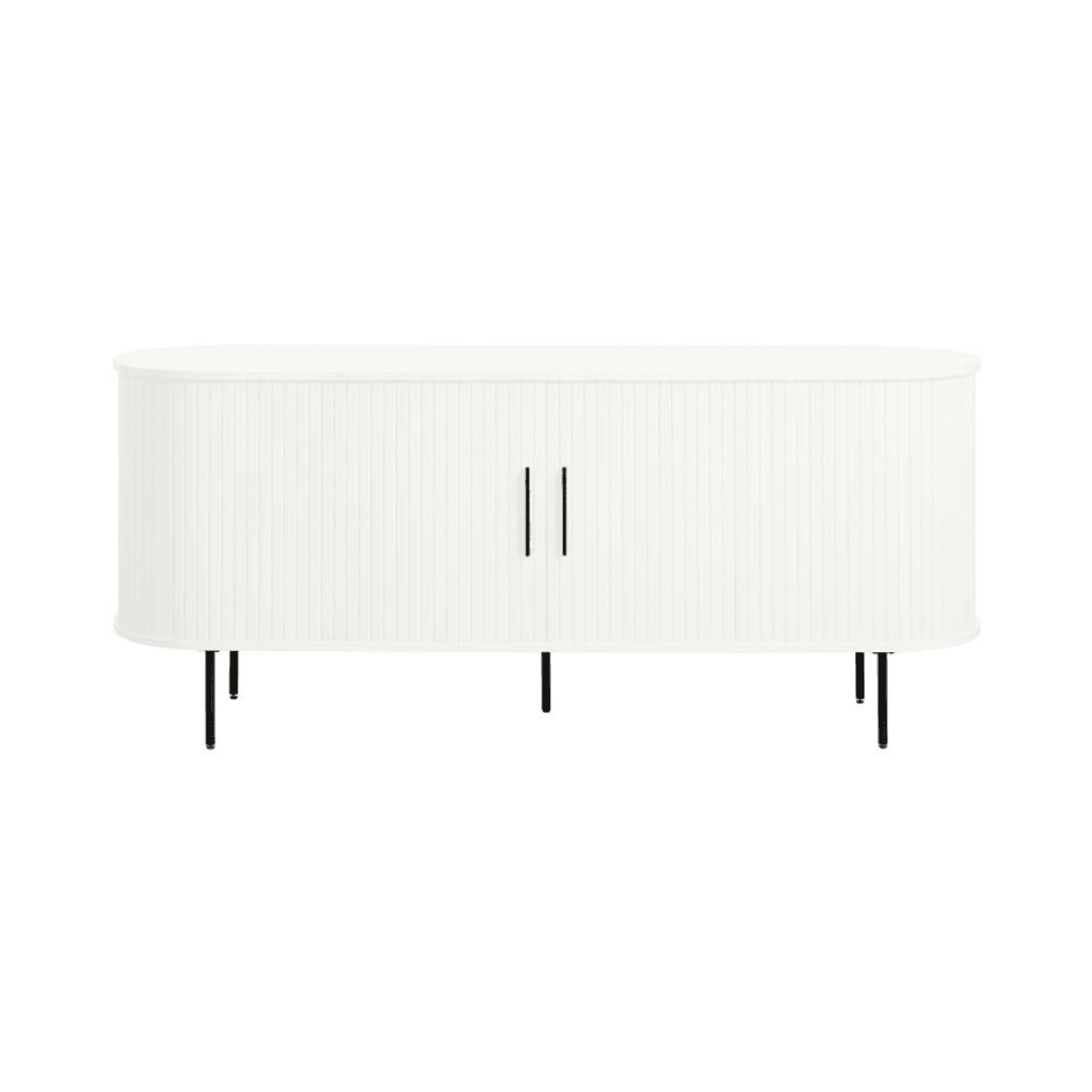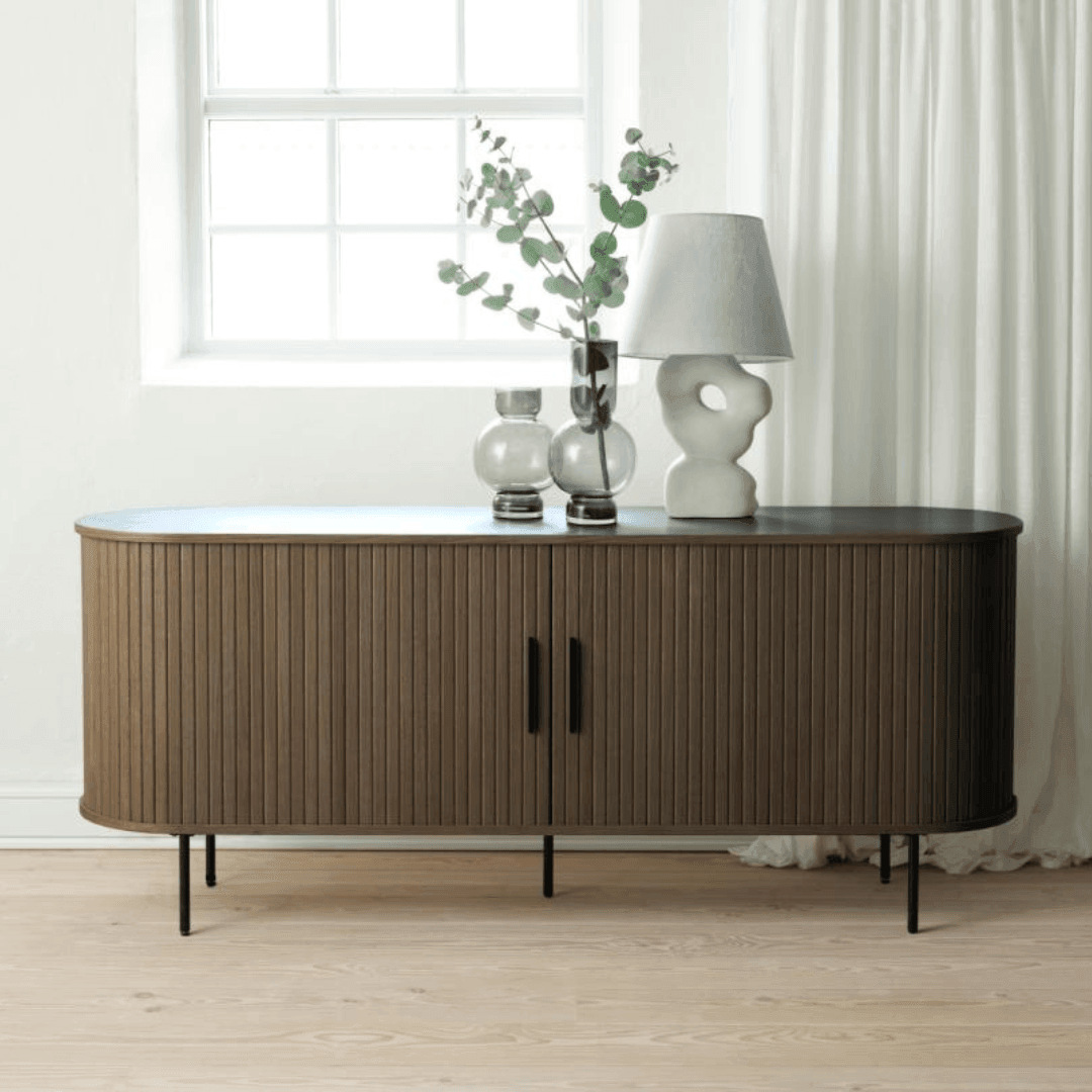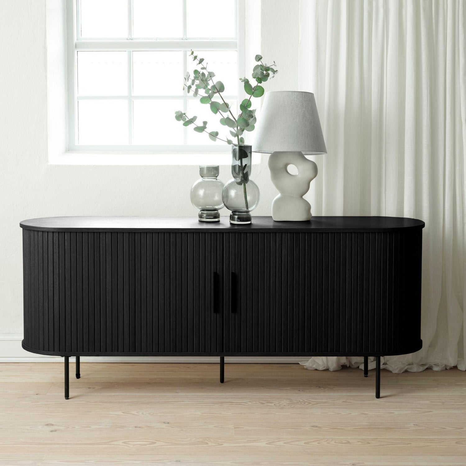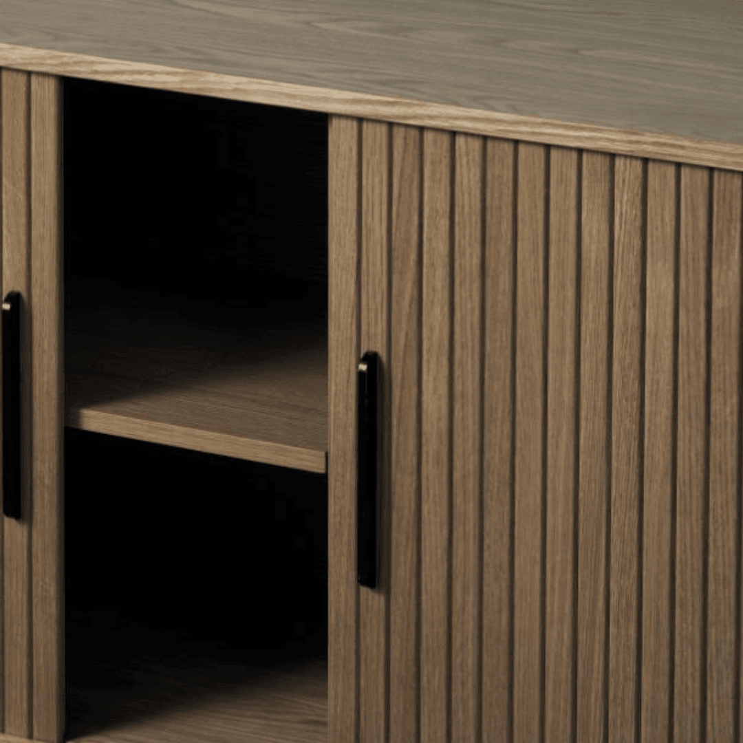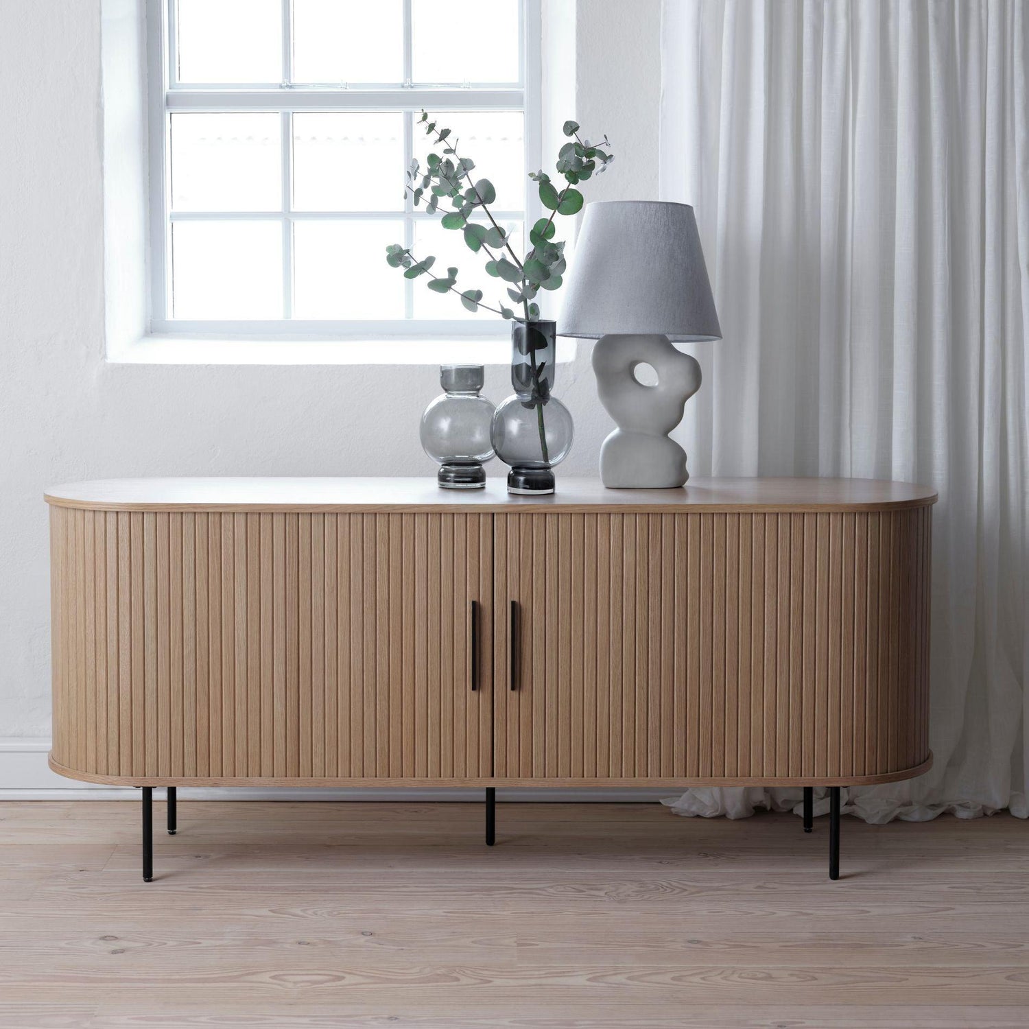 A Nola tolóajtós komód egy elegáns és praktikus bútordarab, amely tökéletesen illeszkedik bármely otthoni enteriőrbe. A komód anyaga natúr színű tölgy furnér, amely időtálló és tartós. A lábak fekete festett fém anyagból készültek, ami modern és stílusos megjelenést kölcsönöz a komódnak. A tolóajtók praktikus megoldást nyújtanak, így helytakarékos és kényelmes használatot tesznek lehetővé.