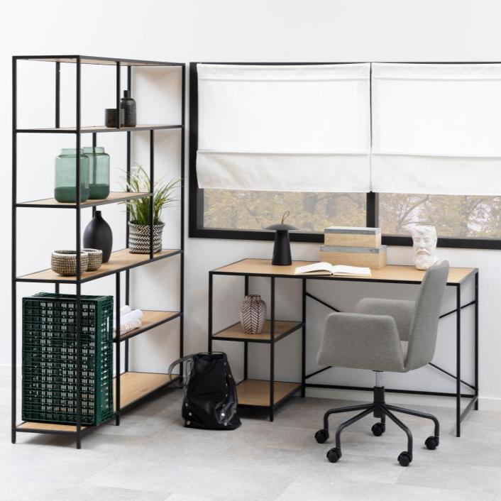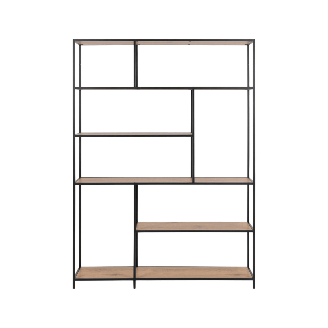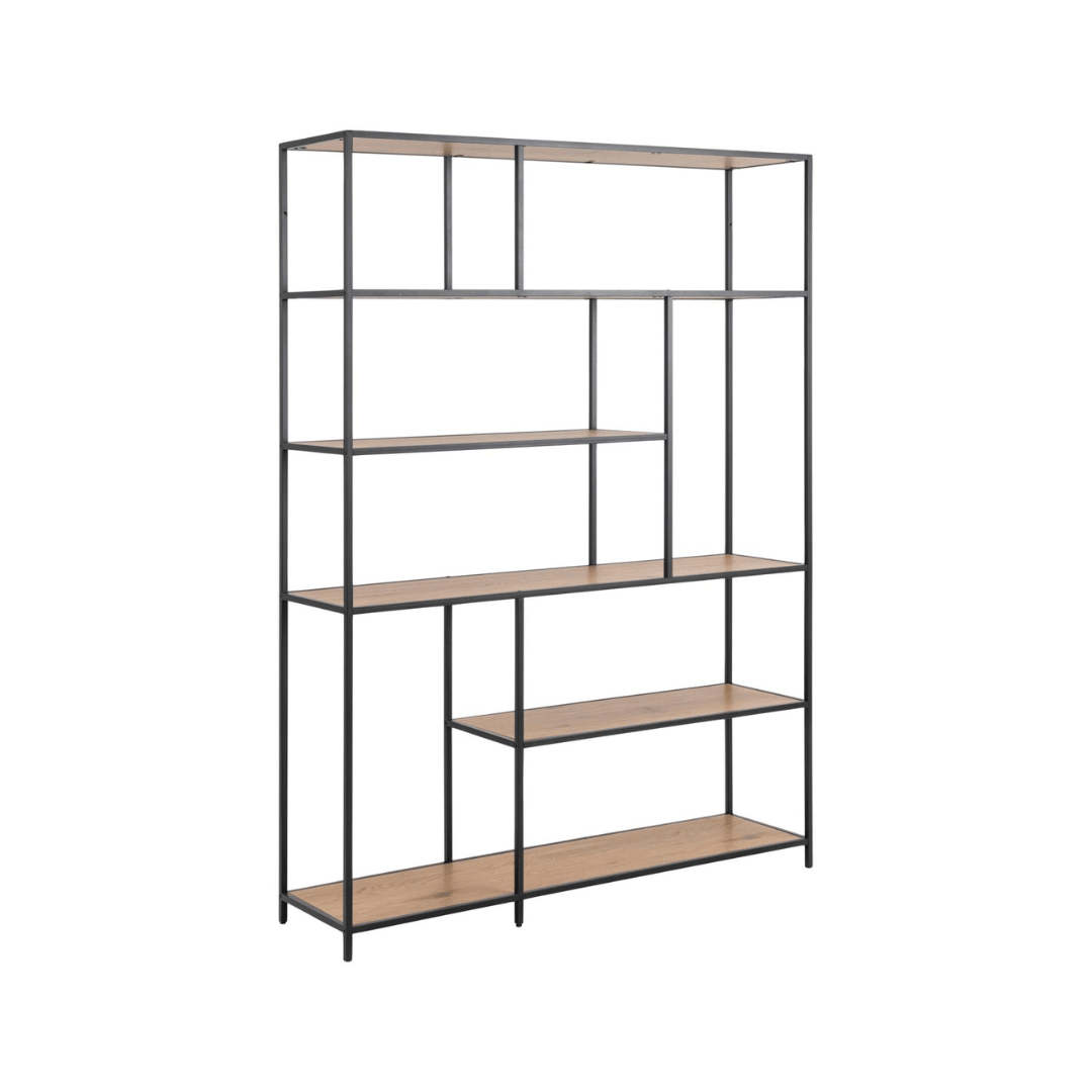Ha otthonodba helyezed ezt az elegáns, ipari megjelenésű Seaford polcot, az aszimmetrikus kialakításnak köszönhetően könnyedén növelheti a helyiség dinamikáját. A fekete porszórt fémkeret és az öt natúr színű polc kombinációja felhívja a figyelmet kedvenc tárgyaidra. Ennek a bútornak az egyik legfontosabb tulajdonsága a könnyű megjelenés, amely jól illeszkedik a különböző belső stílusokhoz.