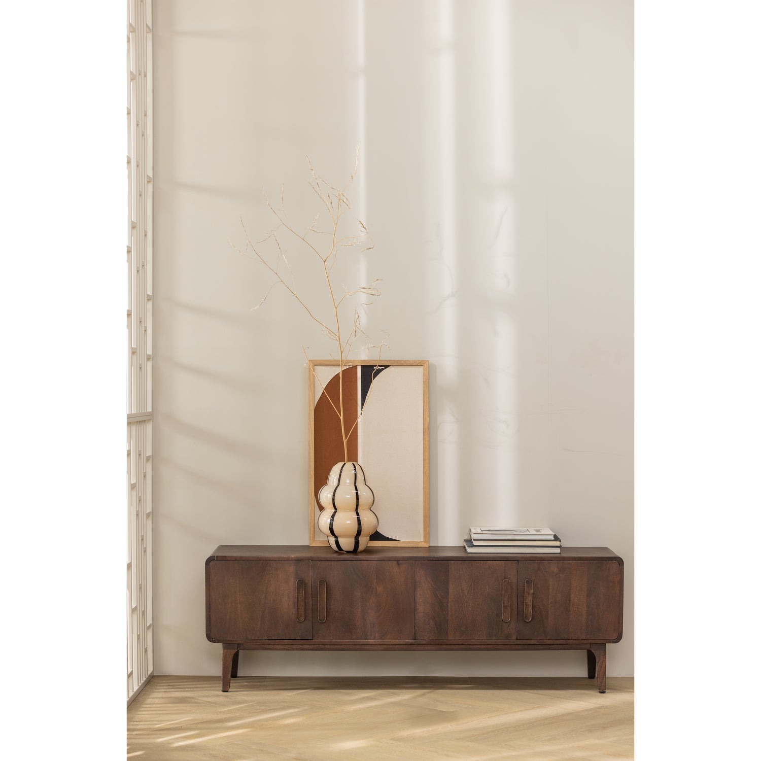 A holland WOOOD belsőépítészeti márka Liya TV-állványa nyugalmat és melegséget áraszt nappalijában. Lekerekített sarkaival és fényűző megjelenésével olyan atmoszférát teremt, ahol egy sűrű nap után teljesen kikapcsolódhat. A mangófa karakteres kisugárzása gyönyörűen illeszkedik a legkülönfélébb lakberendezési stílusokhoz. A 150 cm-es szélesség elegendő helyet biztosít minden technikai eszköznek, miközben rendezett és esztétikus megjelenést kölcsönöz a szobának. Ez a TV-állvány az enteriőr központi pontjává válik, ahol öröm a közös filmezés a családdal és a barátokkal.