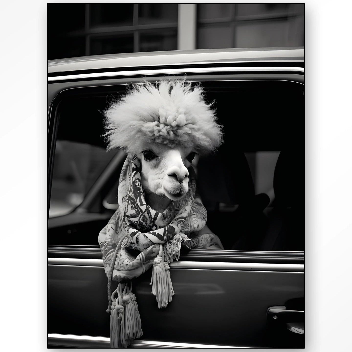 Az Alpaca In Taxi vászonkép egy igényes és stílusos faldekoráció, mely egy vidám alpakát ábrázol, régi amerikai taxiban ülve. A kép különböző méretekben kapható, így minden lakásba tökéletesen illeszkedhet. A fekete-fehér esztétika és a derűs tematika teszi ezt a képet igazán különlegessé. New York csodálóinak kiváló ajándék lehet. A képet keretezve szállítjuk.