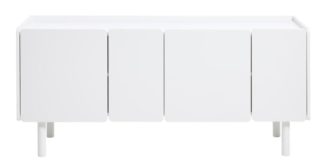 A Bera komód a modern belső terek praktikus és stílusos központja. A 160 cm széles test és a frontok kiváló minőségű MDF-ből készültek, amely sima és ellenálló felületet biztosít. A masszív fém lábak stabil alátámasztást adnak, miközben a 20 cm-es magasságukkal megemelik a bútort, így a nagy méret ellenére is könnyed, légies marad az összhatás. A négy ajtó mögött tágas polcrendszer található, amely ideális étkészletek, társasjátékok vagy egyéb háztartási eszközök rendezett tárolására.