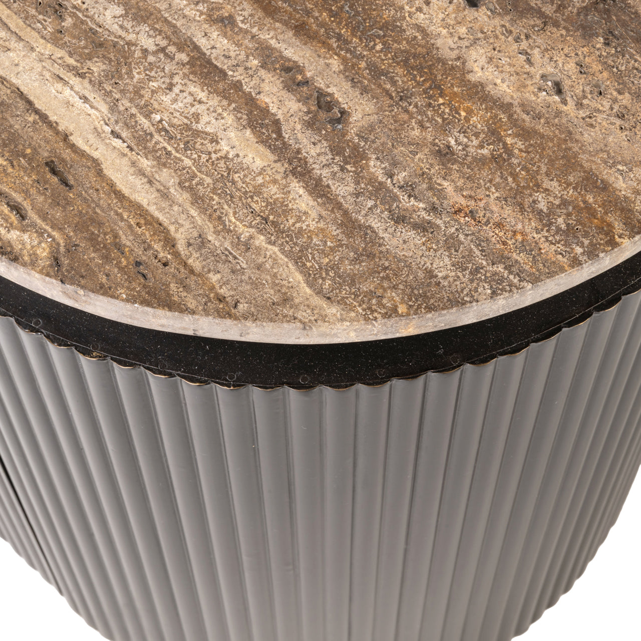Nemes anyagkombináció: A travertin kő, a minőségi MDF és a sárgaréz ötvözete a legmagasabb minőségi igényeket is kielégíti.