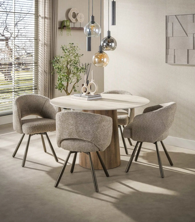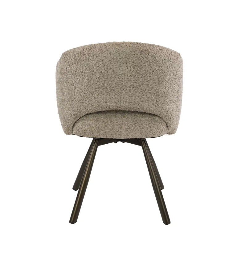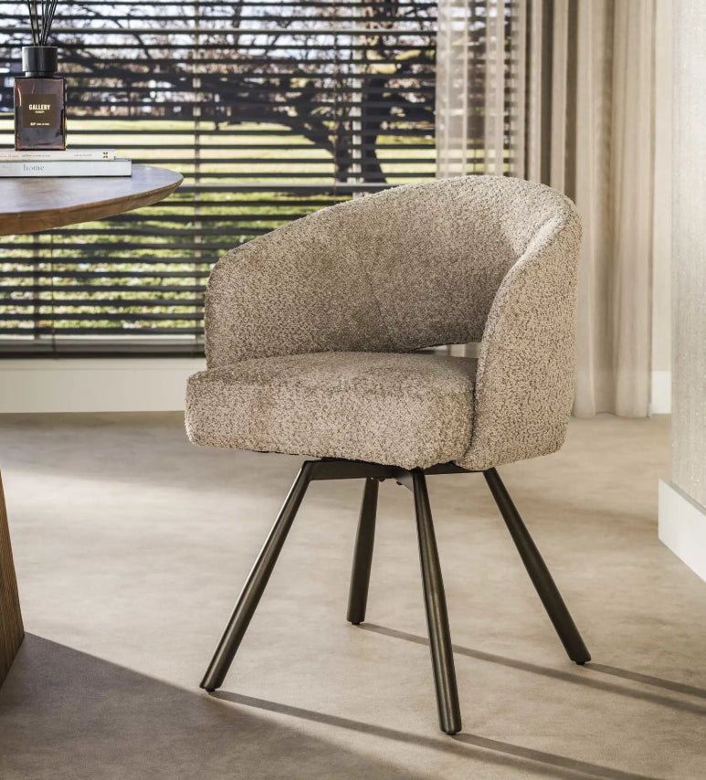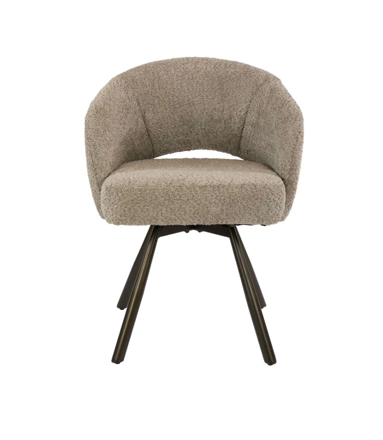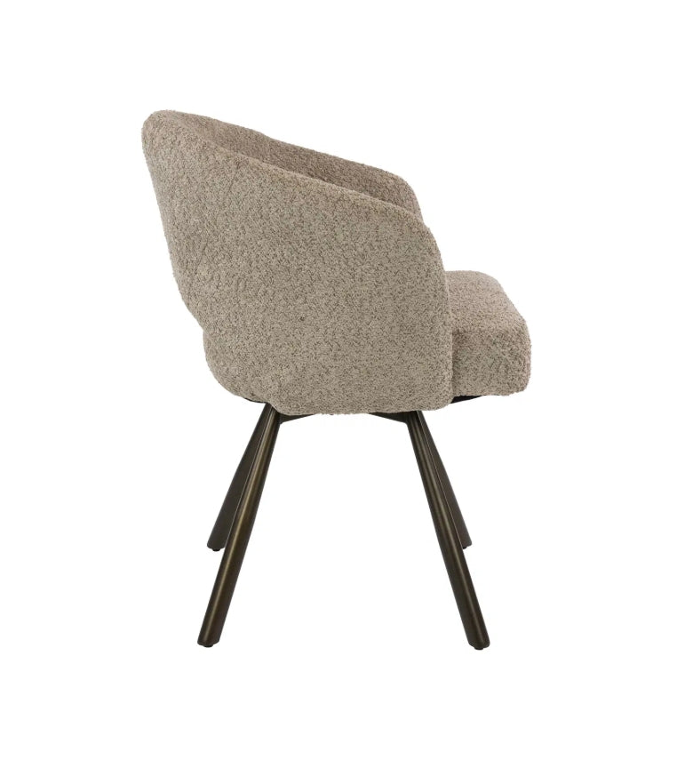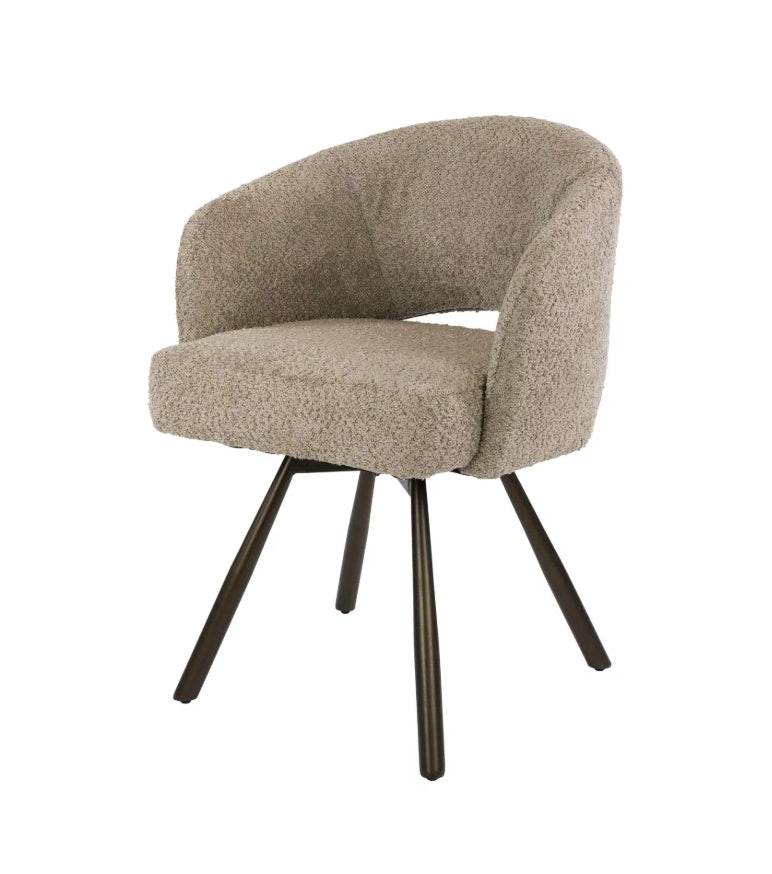 A Salon Cross forgófotel bouclé vagy cargo kárpittal rendelhető, és bronzszínű, porszórt fém talpszerkezeten áll, amely 360 fokos forgathatóságot biztosít. A zsákrugós ülőszerkezet kiemelkedő kényelmet nyújt mindennapi használat mellett is, miközben a kereszt alakú talpszerkezet modern és elegáns összképet teremt. A bouclé szövet strukturált, bolyhos felülete meleg, otthonos hangulatot áraszt, és könnyen illeszkedik kortárs enteriőrökhöz. A letisztult forma és a prémium anyagkombináció révén a fotel étkezőben és nappaliban egyaránt megállja a helyét. A termék páronként kerül csomagolásra, az ár darabonként értendő.