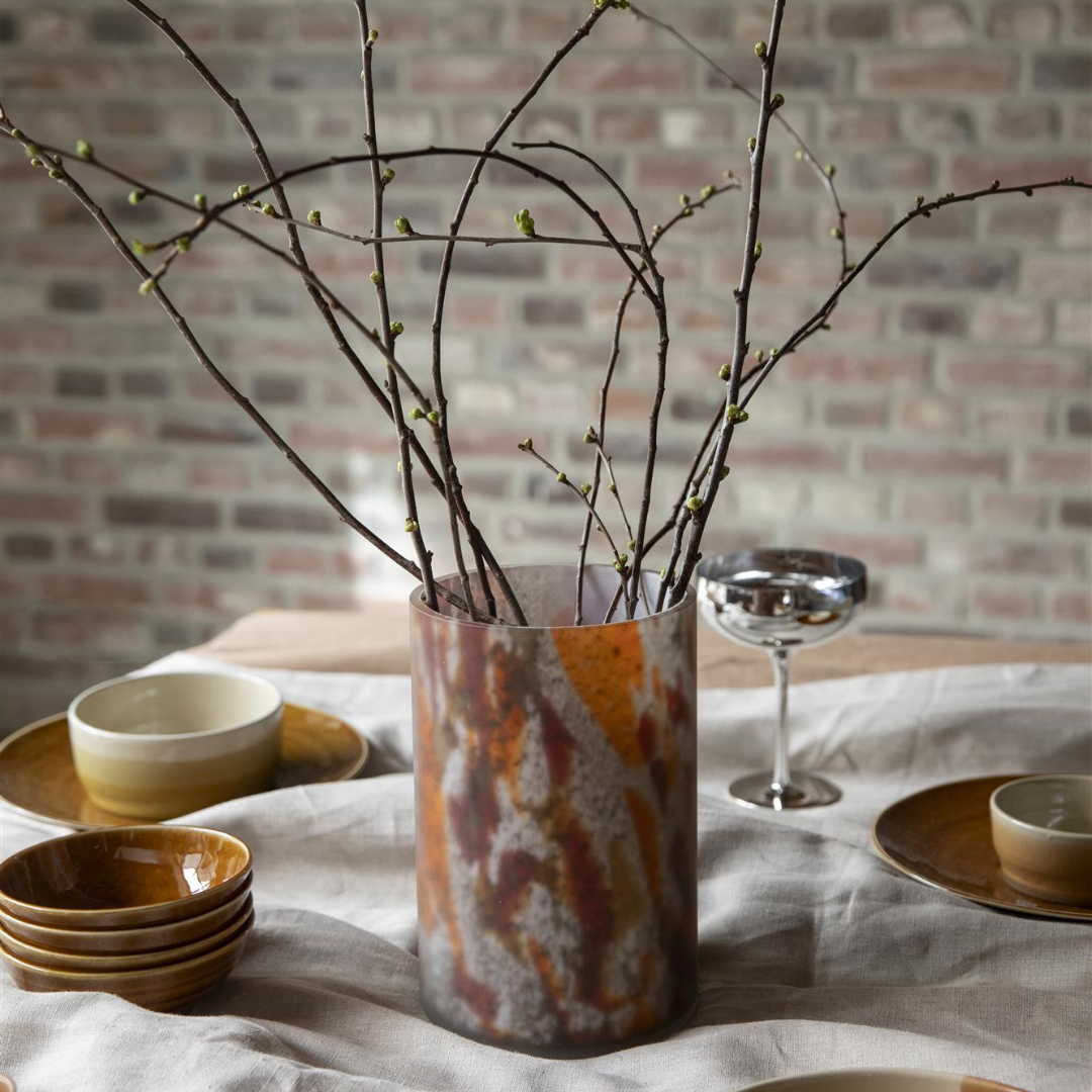 Néha apró kiegészítők is teljesen új hangulatot teremthetnek otthonodban. Az Earl váza azonnal kellemes, meleg hangulatot varázsol bármely térbe. A matt üveg meleg tónusú, mintás dizájnnal díszített, amelyek játékosan olvadnak össze, mint egy stílusos akvarellfestmény. Az Indiában kézzel készített vázák mindegyike egyedi, a forma finom változataival.