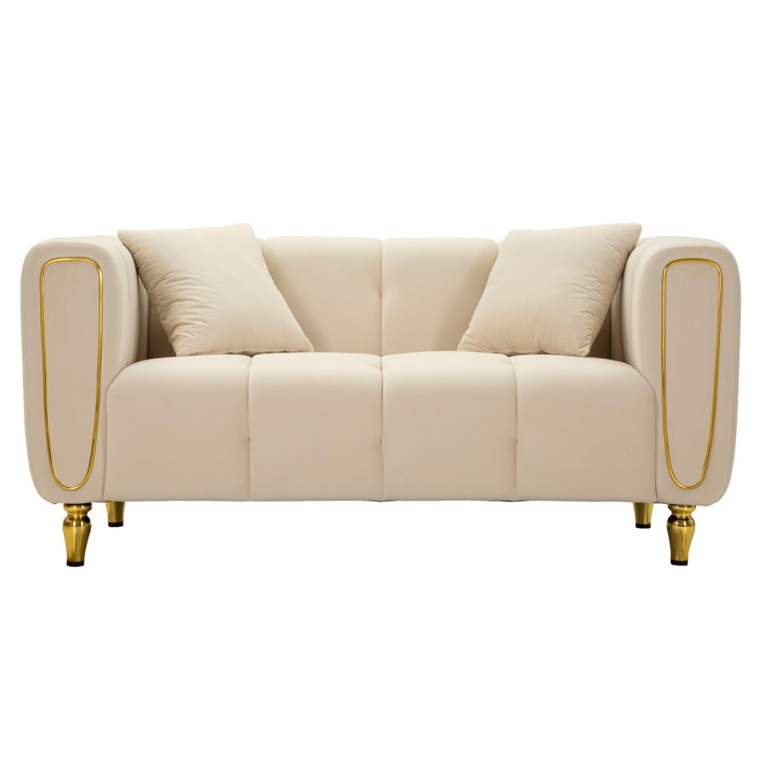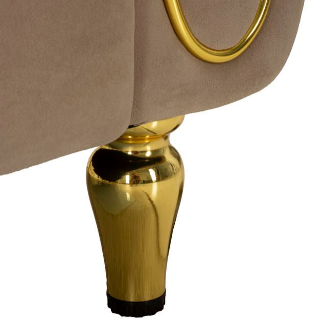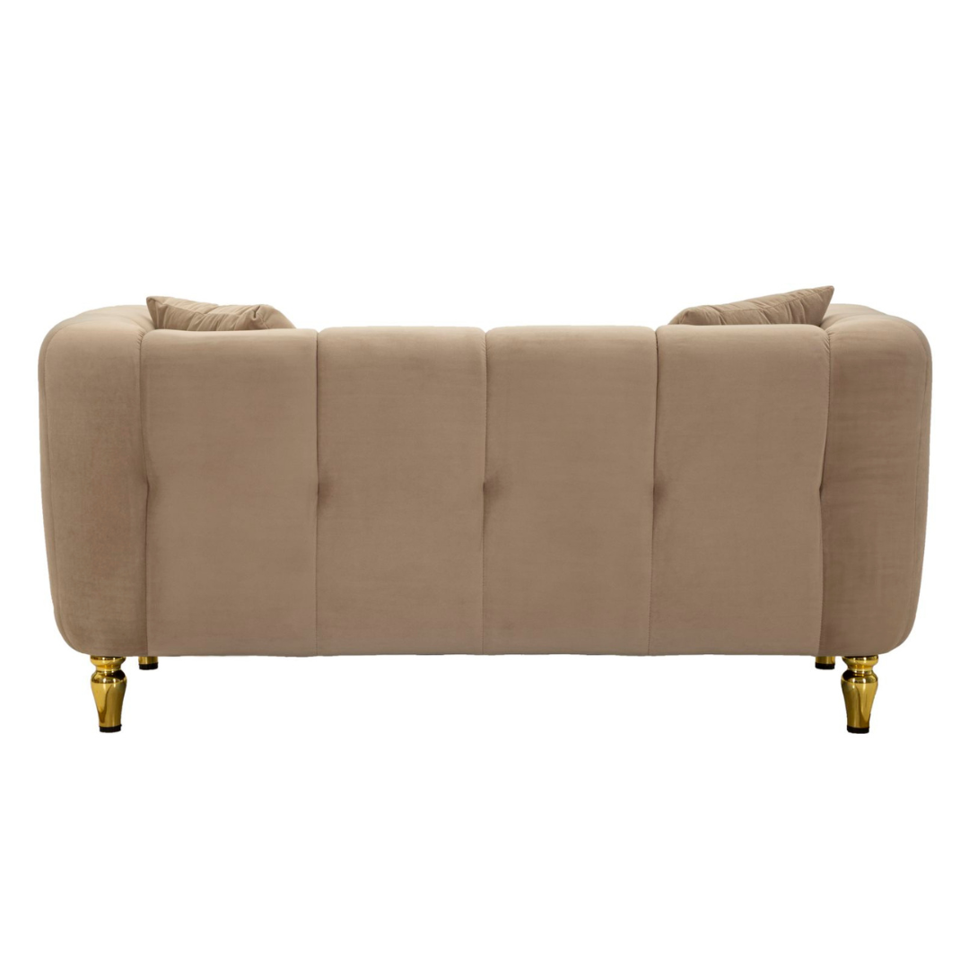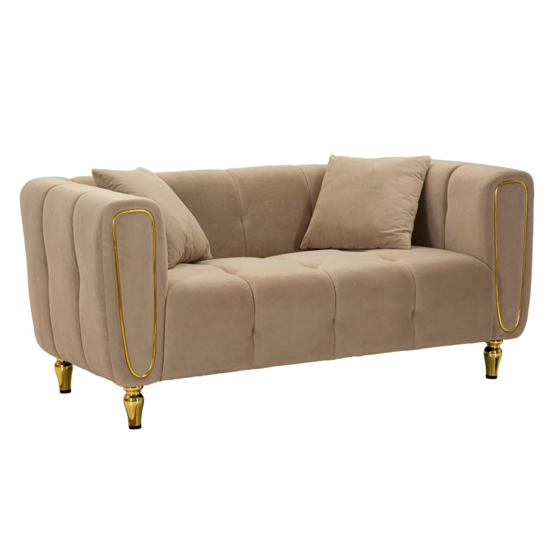 Alma is a 2-seater sofa designed in a classy style, with a comfortable and deep seating surface. Its beige or light brown velvet, tufted upholstery offers a clean and aesthetic look, making it a perfect fit for any space. Its gold-colored metal legs perfectly complement its sophisticated silhouette. Combine with the Alma collection armchair for perfect comfort.